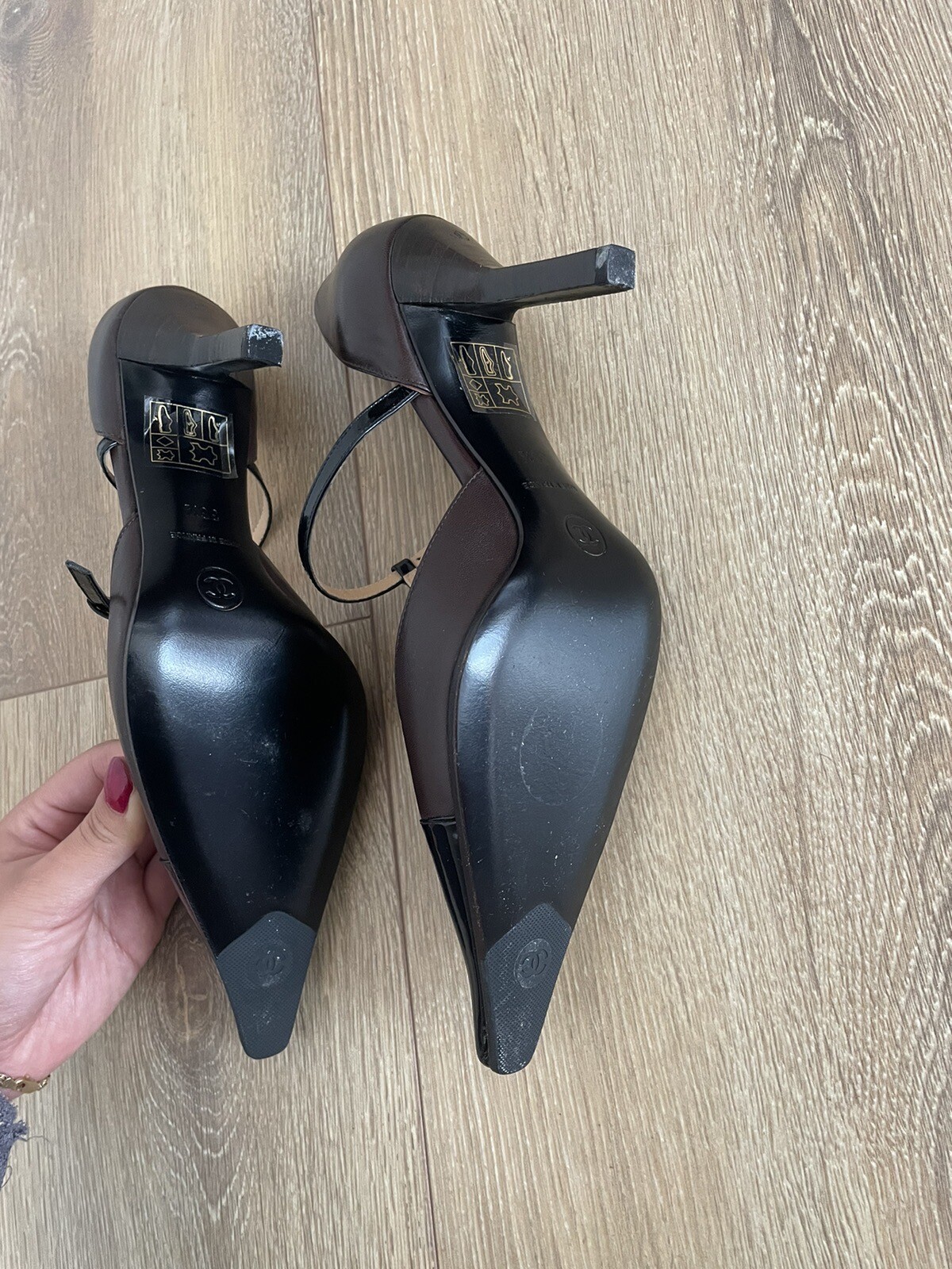 как выглядит Chanel T-Strap Pumps 36.5 6.5 Two Tone Pointed Cap Toe Logo Authentic Leather фото