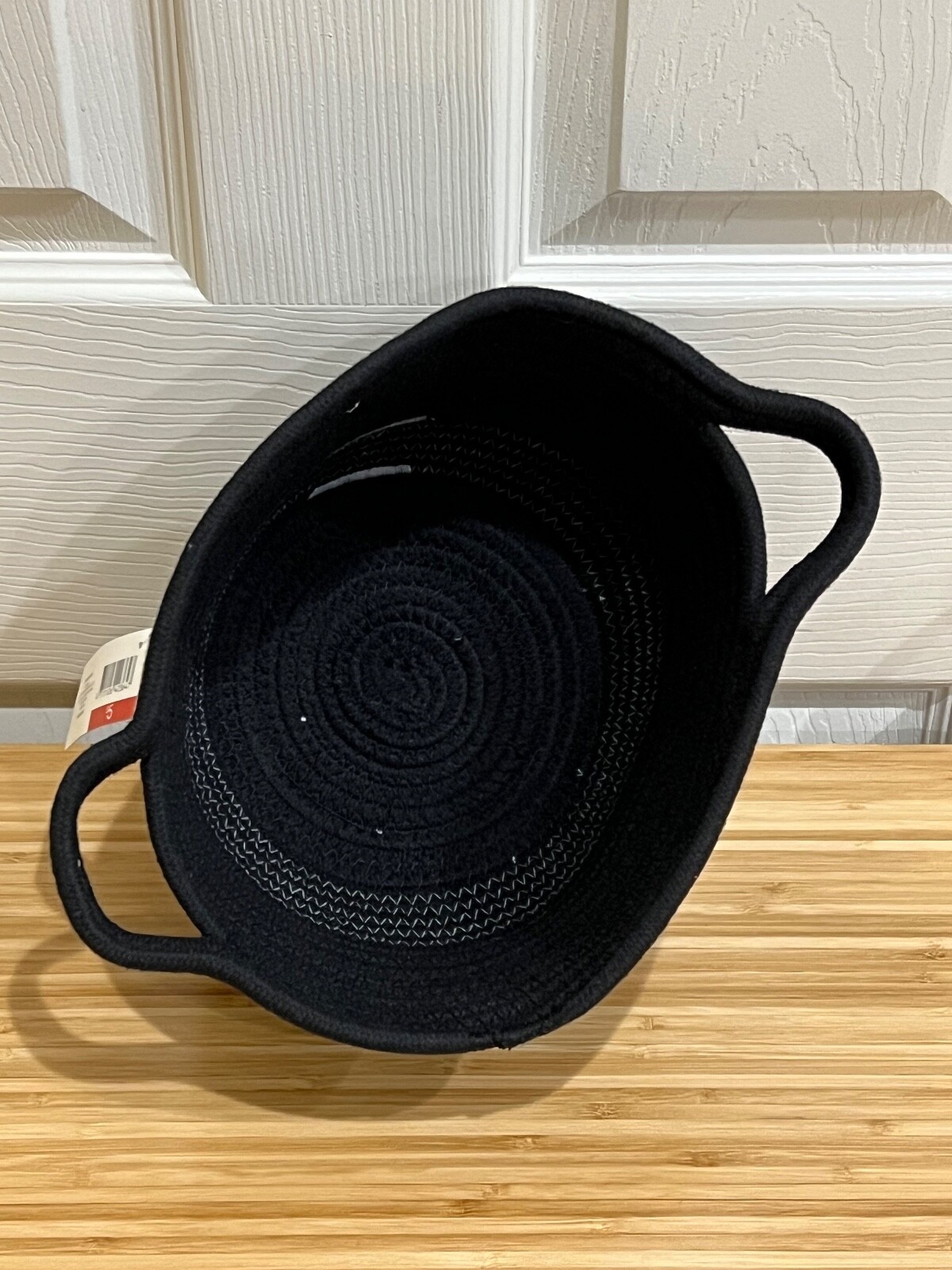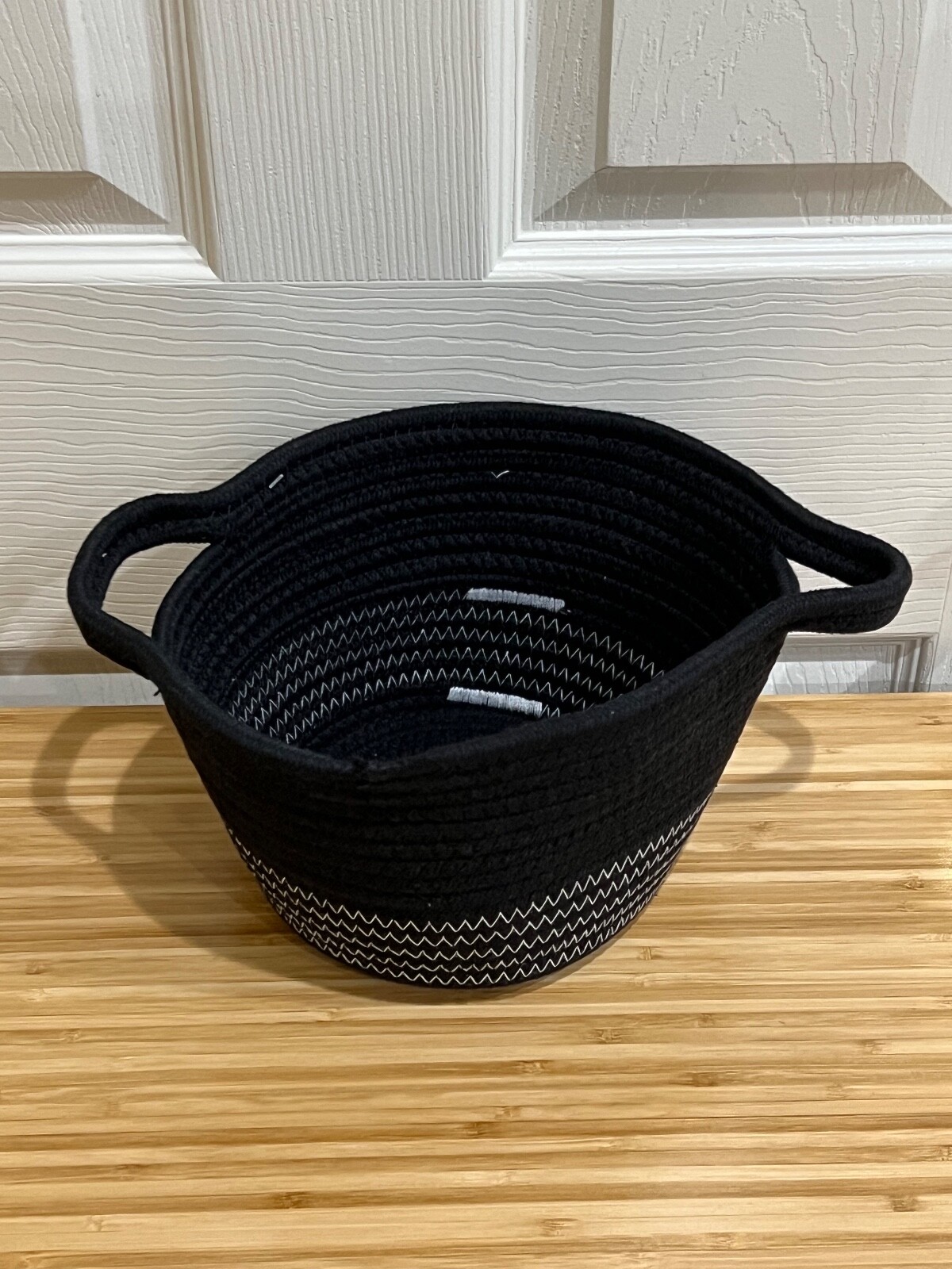 как выглядит Brand New Black Rope Basket with White Accents and Handles Woven Round 6"T x 9"D фото