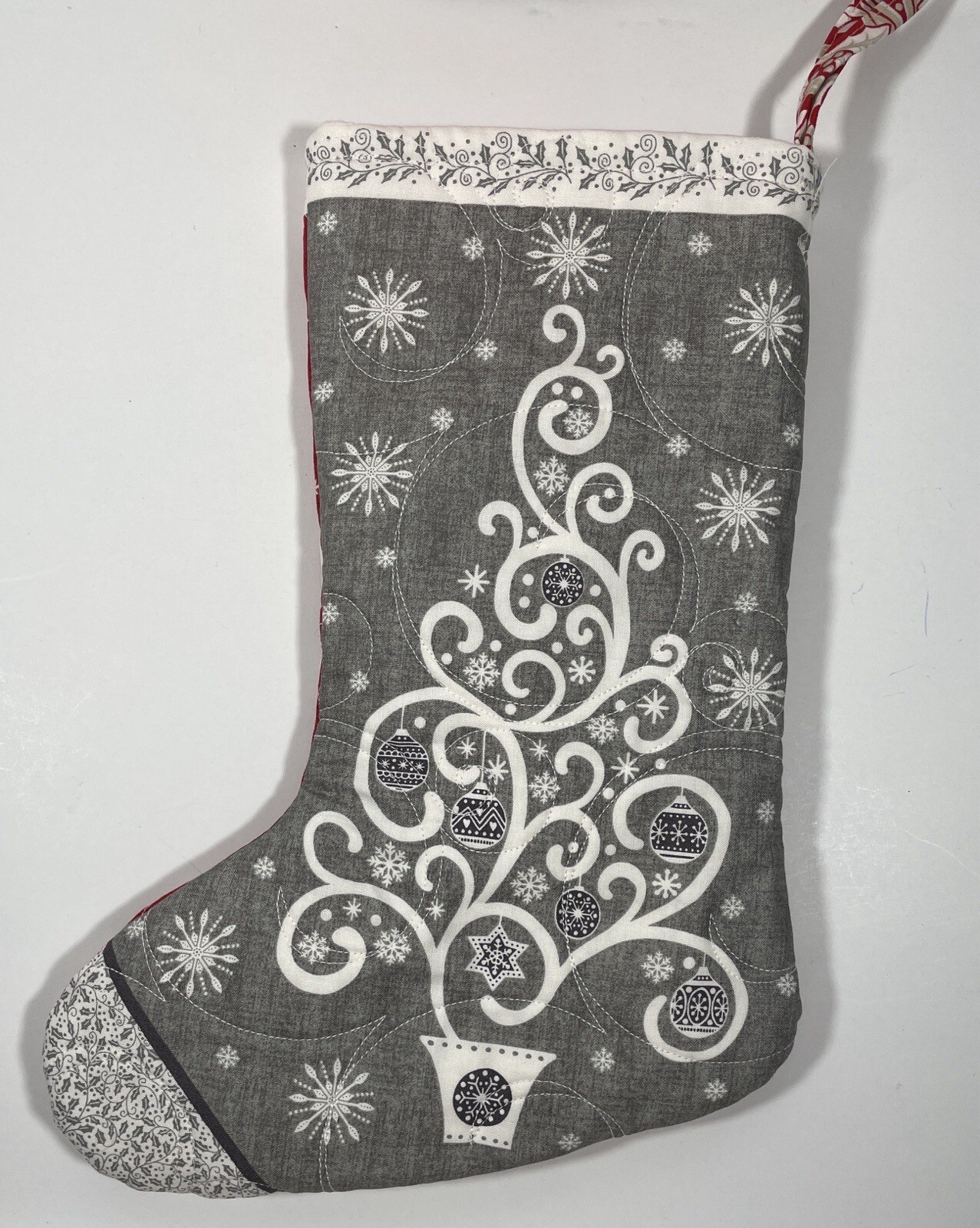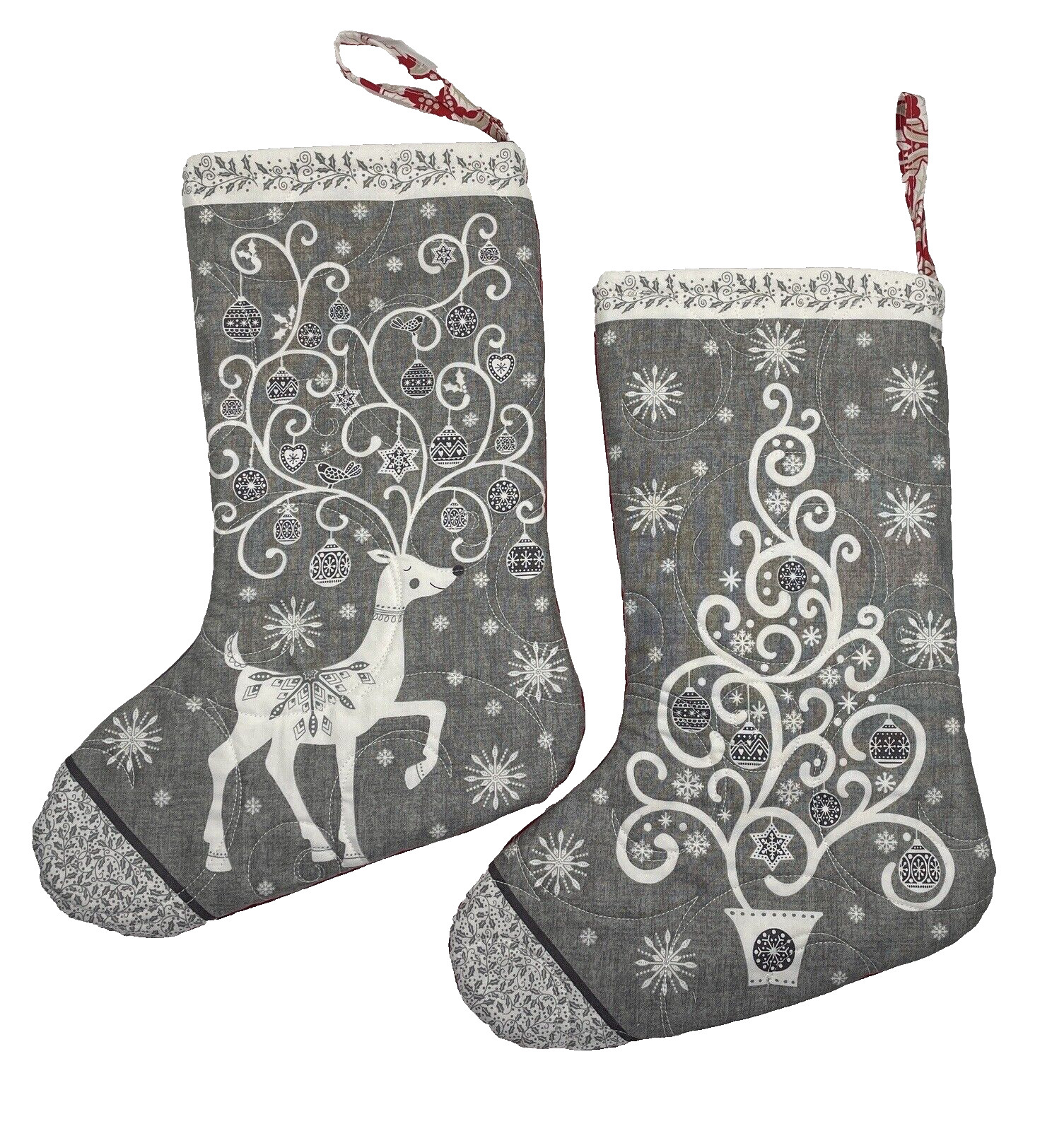 Quilted Charismas Stockings set of 2 Red Gray with Scandinavian Deer and Trees