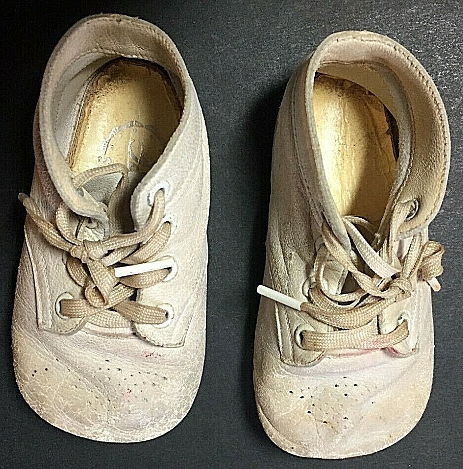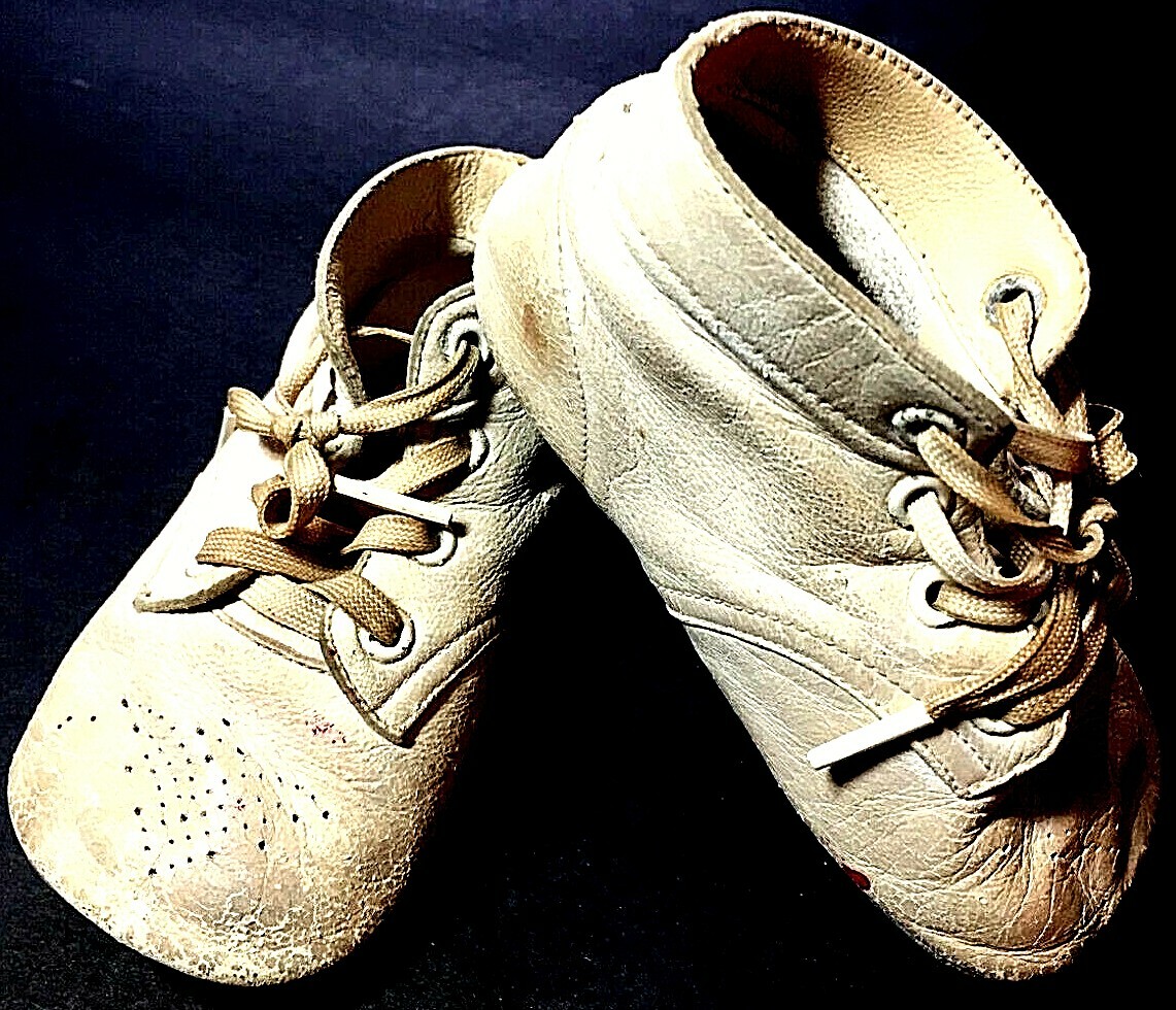 как выглядит 1940s MRS DAYS Ideal Baby Shoes NEWBORN White with suede soles clearly marked фото