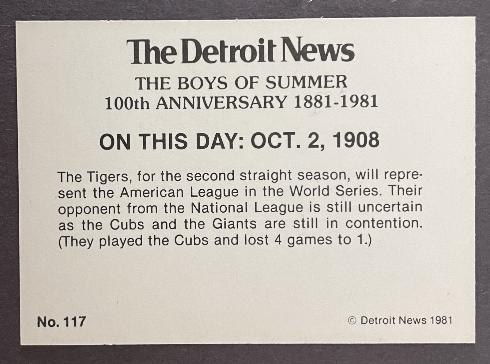 Card Name: 1981 "Detroit News" #117 On This Day Oct 2 1908