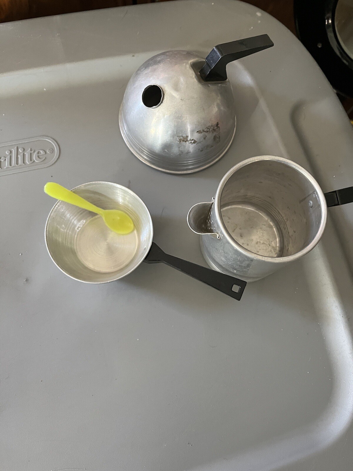 Vintage Child's Tin Aluminum Art Deco Cookware Cook Kitchen Set 4 PCs