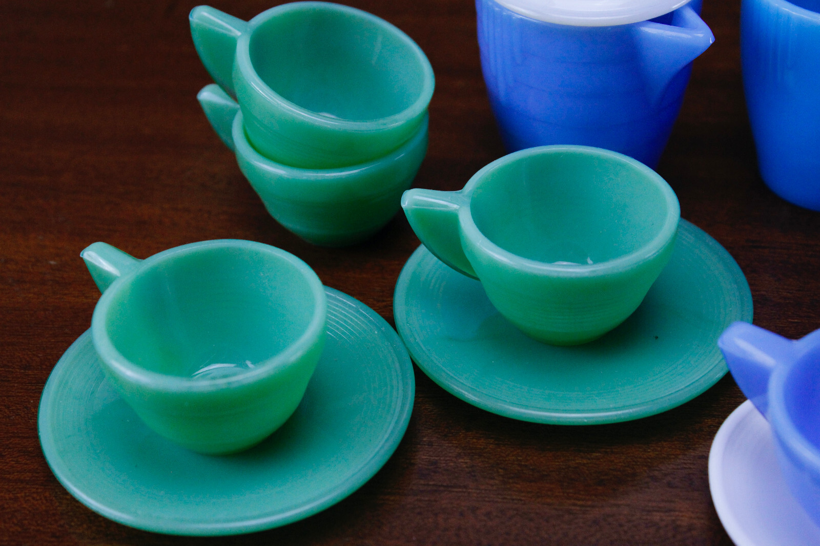 как выглядит Akro Agate Childs Play Time Glass Tea Dish Set N0 Box 16 Piece Jadite/Delphite фото