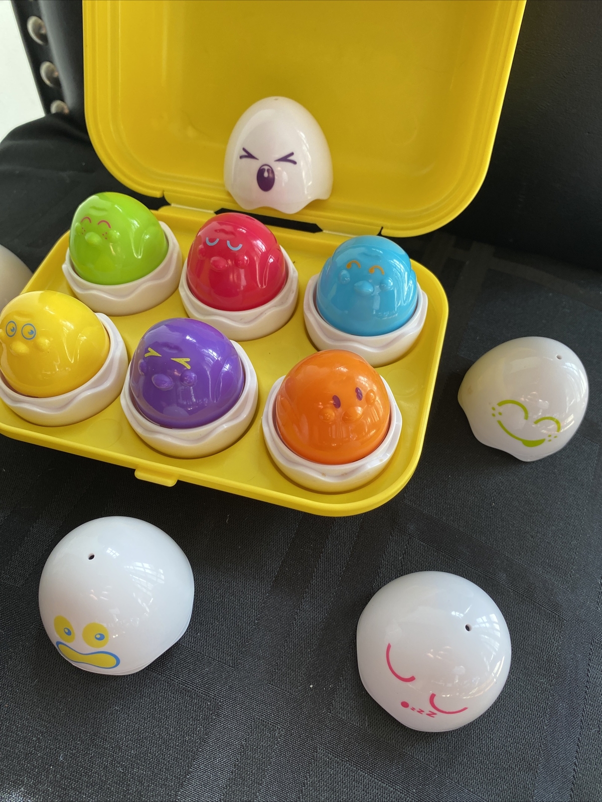как выглядит Vintage 1993 Tomy Hide Squeak Eggs Shape Color Sorting Chicks Egg Carton Toy фото
