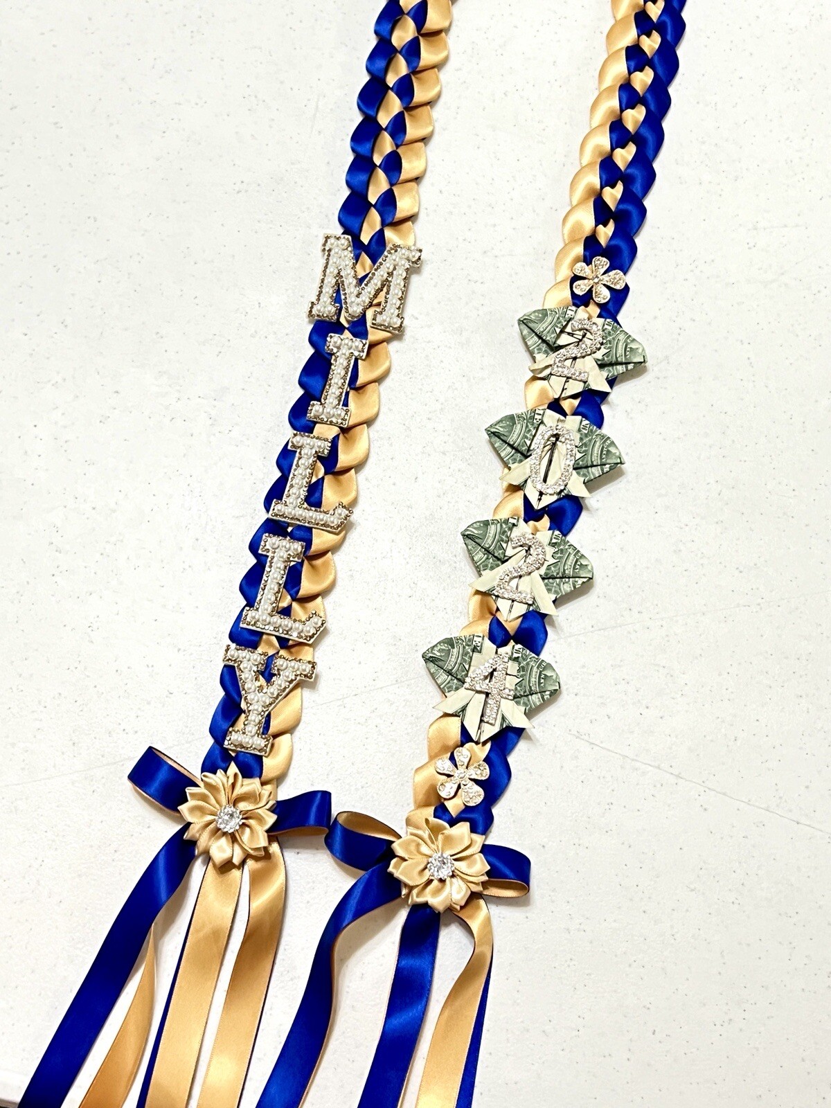 • CUSTOM Graduation 2 Bill Money Lei - 2 Colors Personalized Lei, Rhinestone
