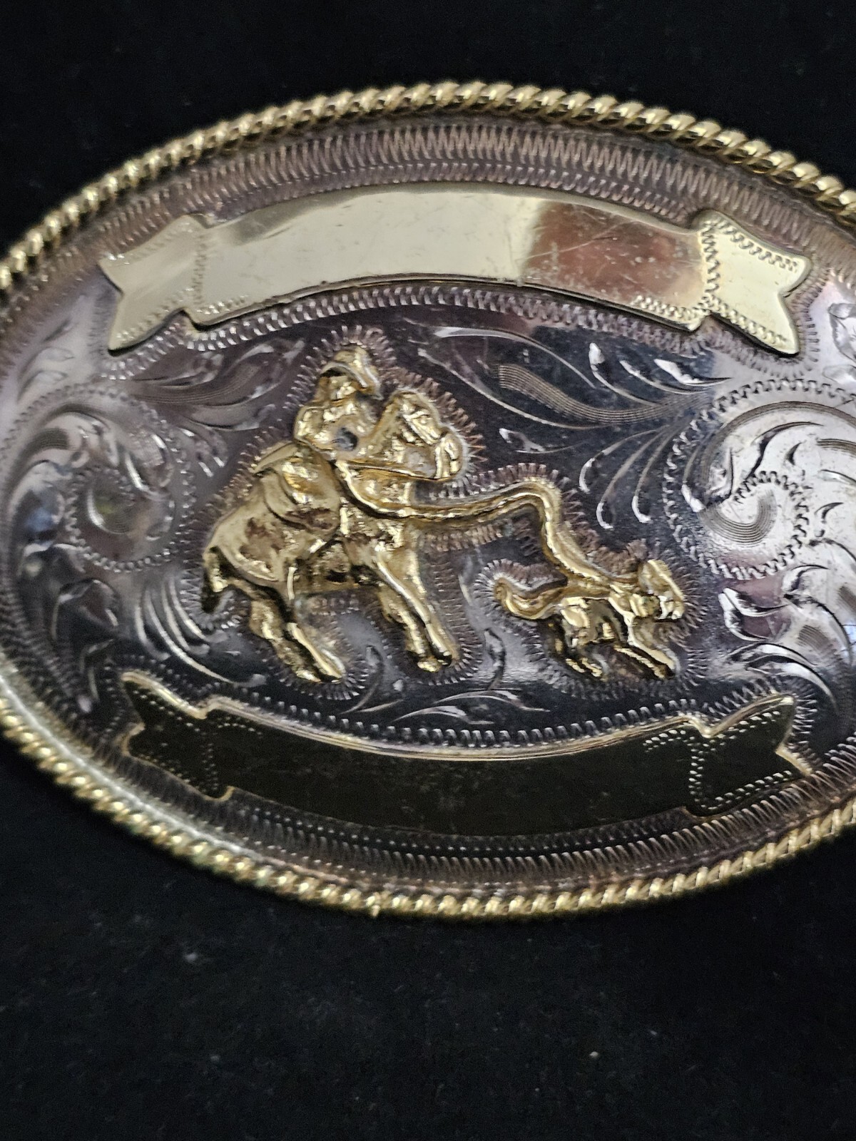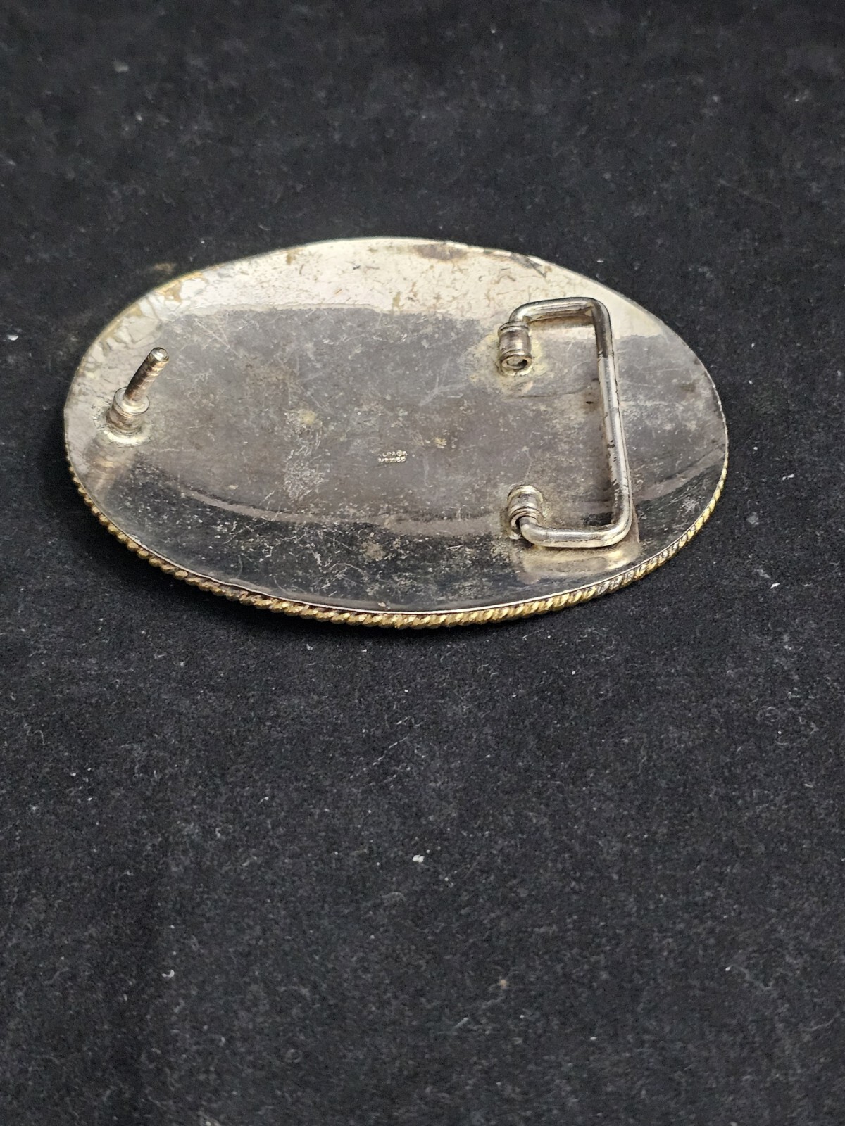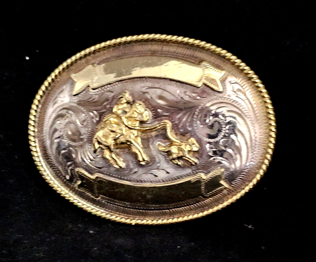 VINTAGE MEXICO ALPACA BRASS HORSE CALF ROPING WESTERN RODEO BELT BUCKLE