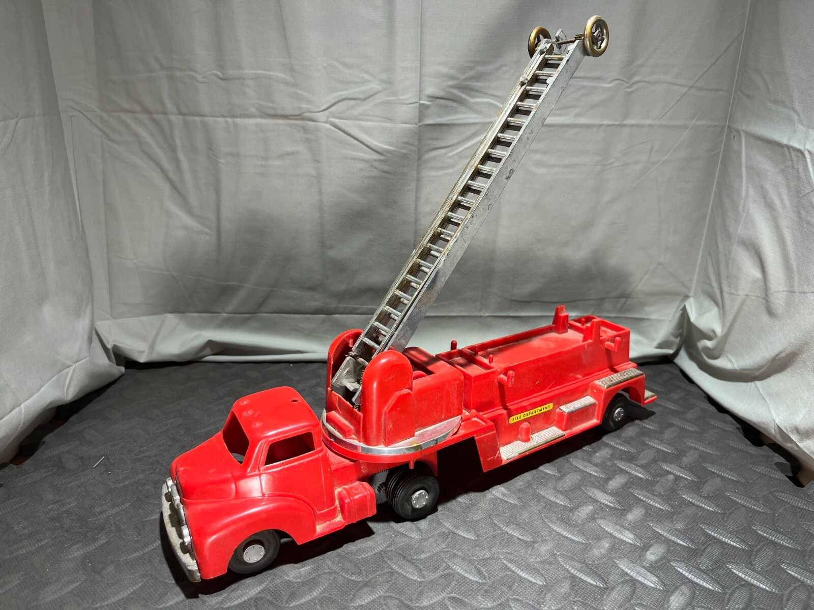 VINTAGE PLASTIC METAL WINDUP LADDER FIRE TRUCK RED