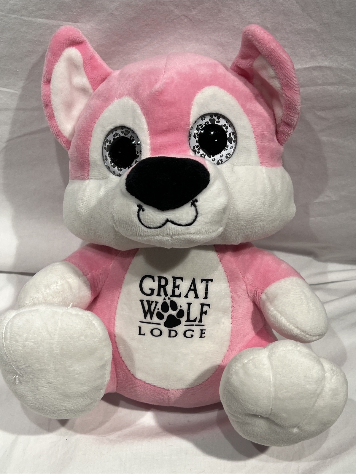 как выглядит Great Wolf Lodge Sitting Wolf with Pink And White Plush Stuffed Animal фото