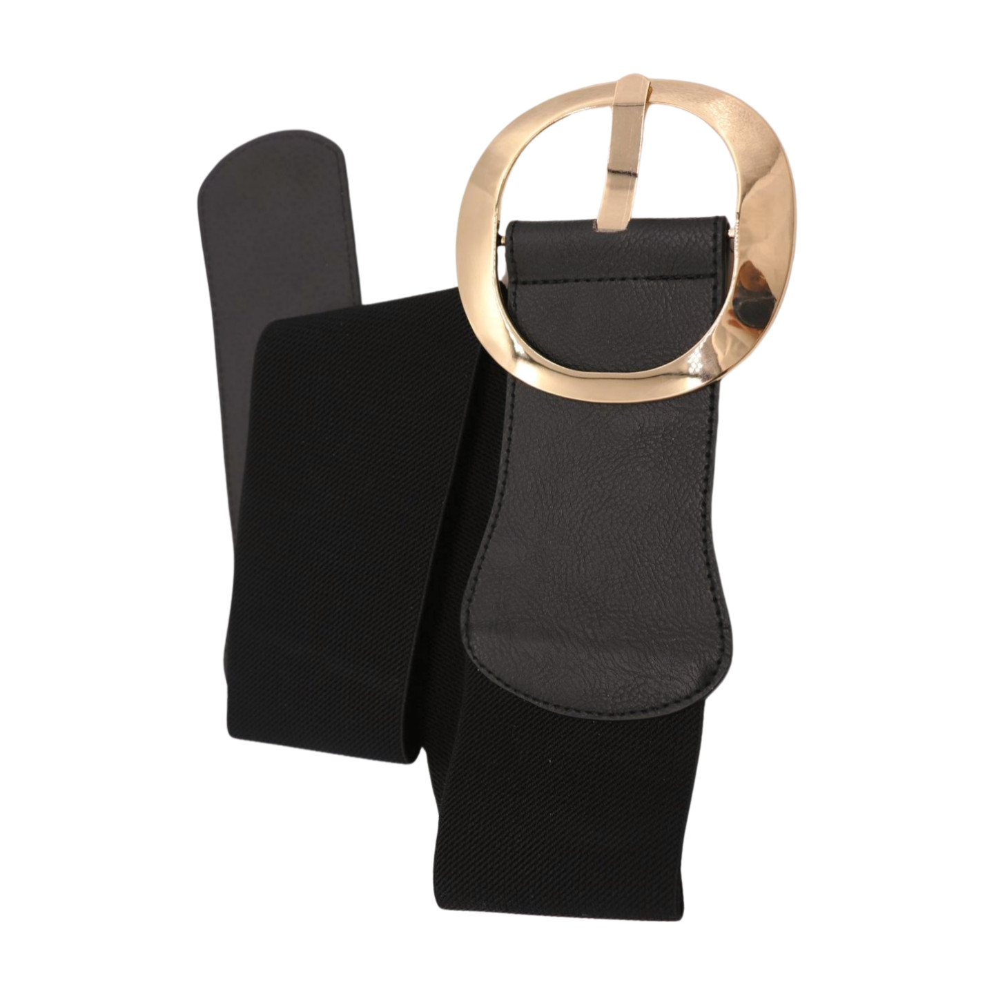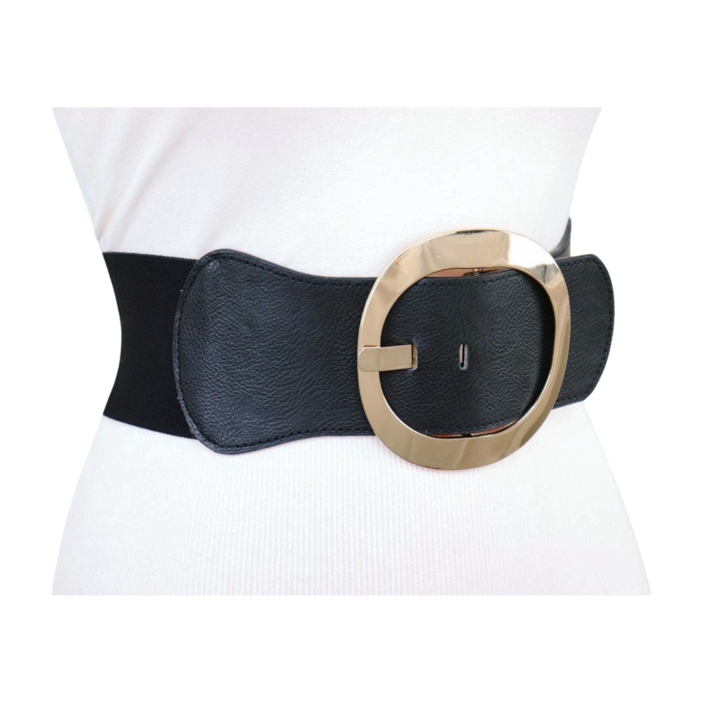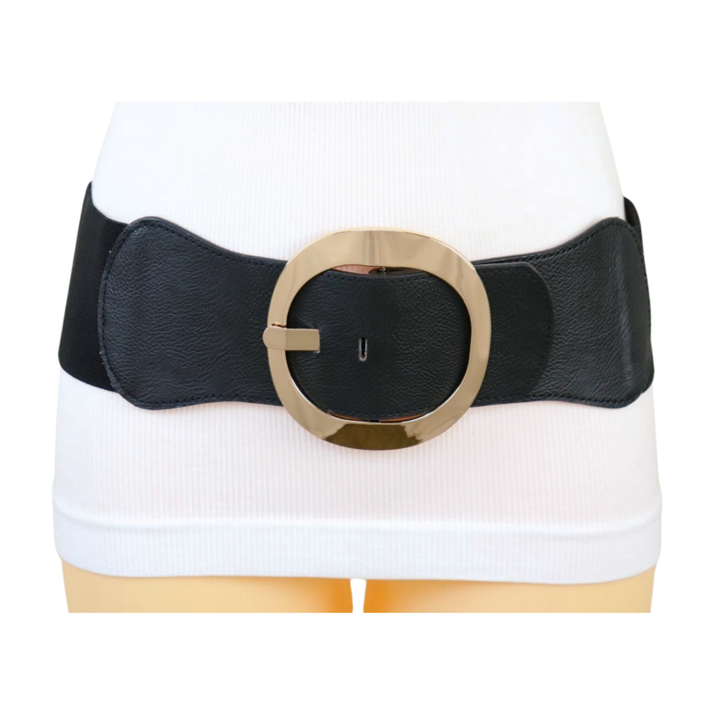 как выглядит Women Black Wide Elastic Waistband Statement Fashion Belt Gold Round Buckle S фото
