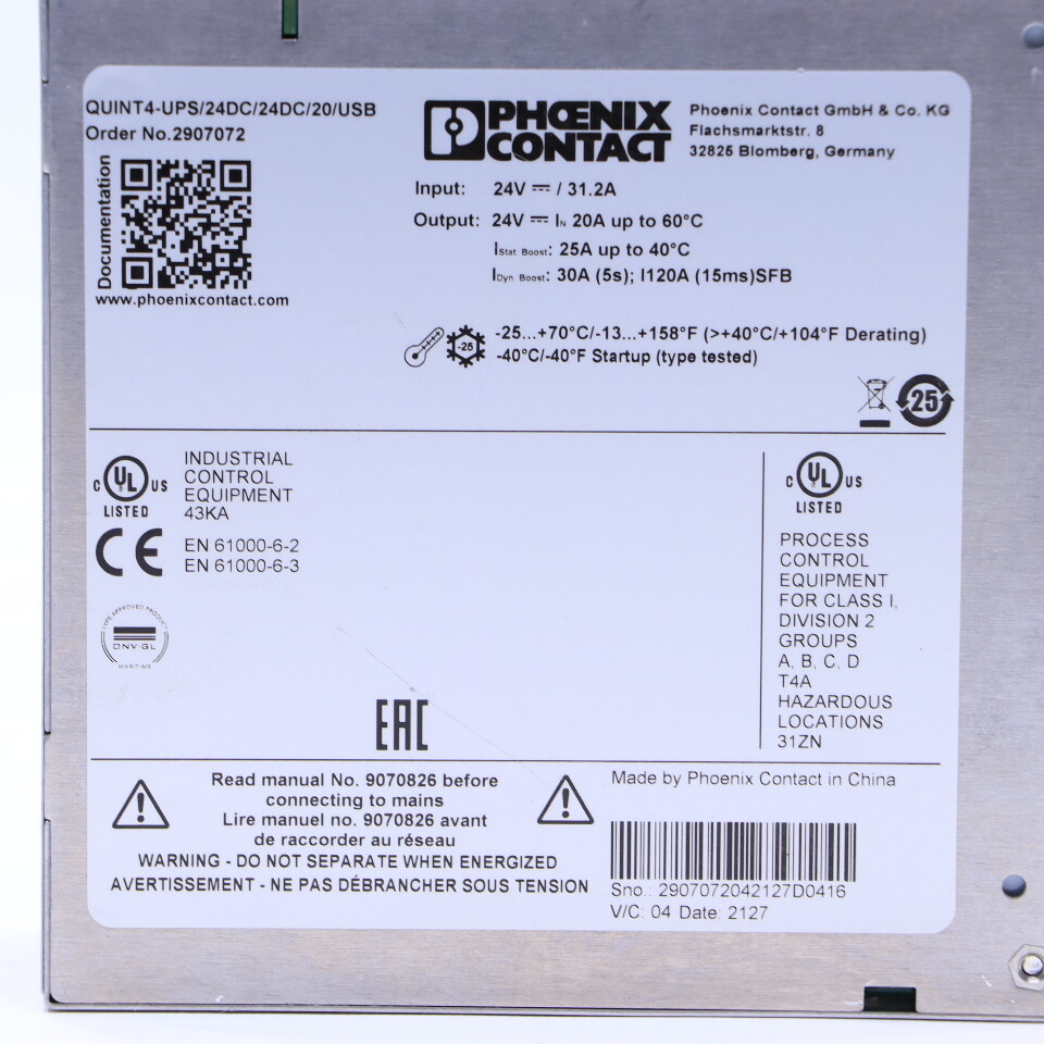 PHOENIX CONTACT QUINT4-UPS/24DC/24DC/20/USB UNINTERRUPTIBLE POWER SUPPLY