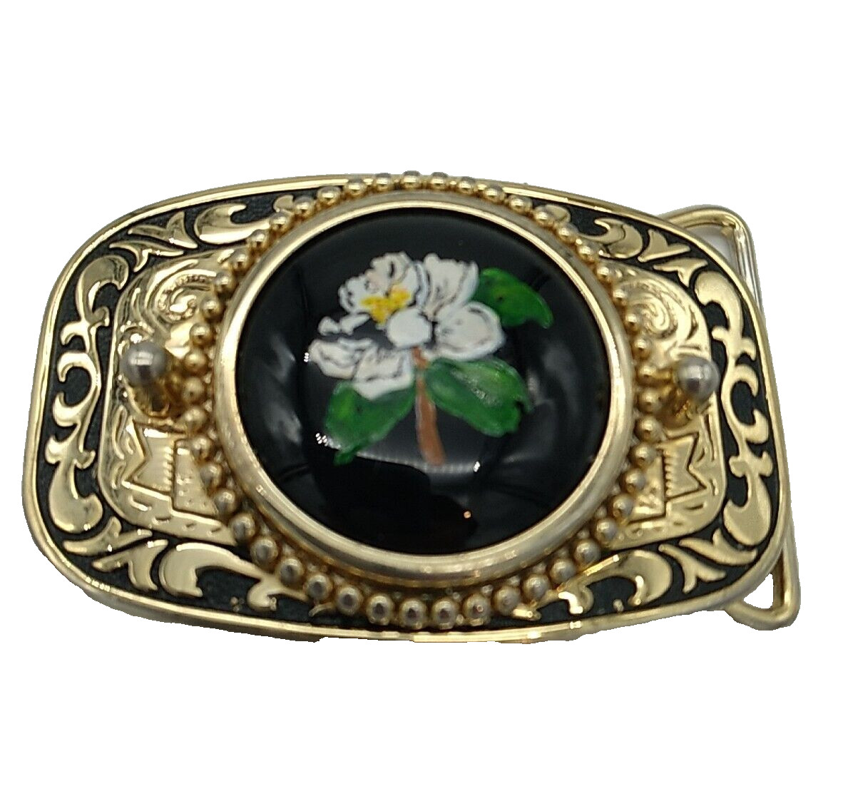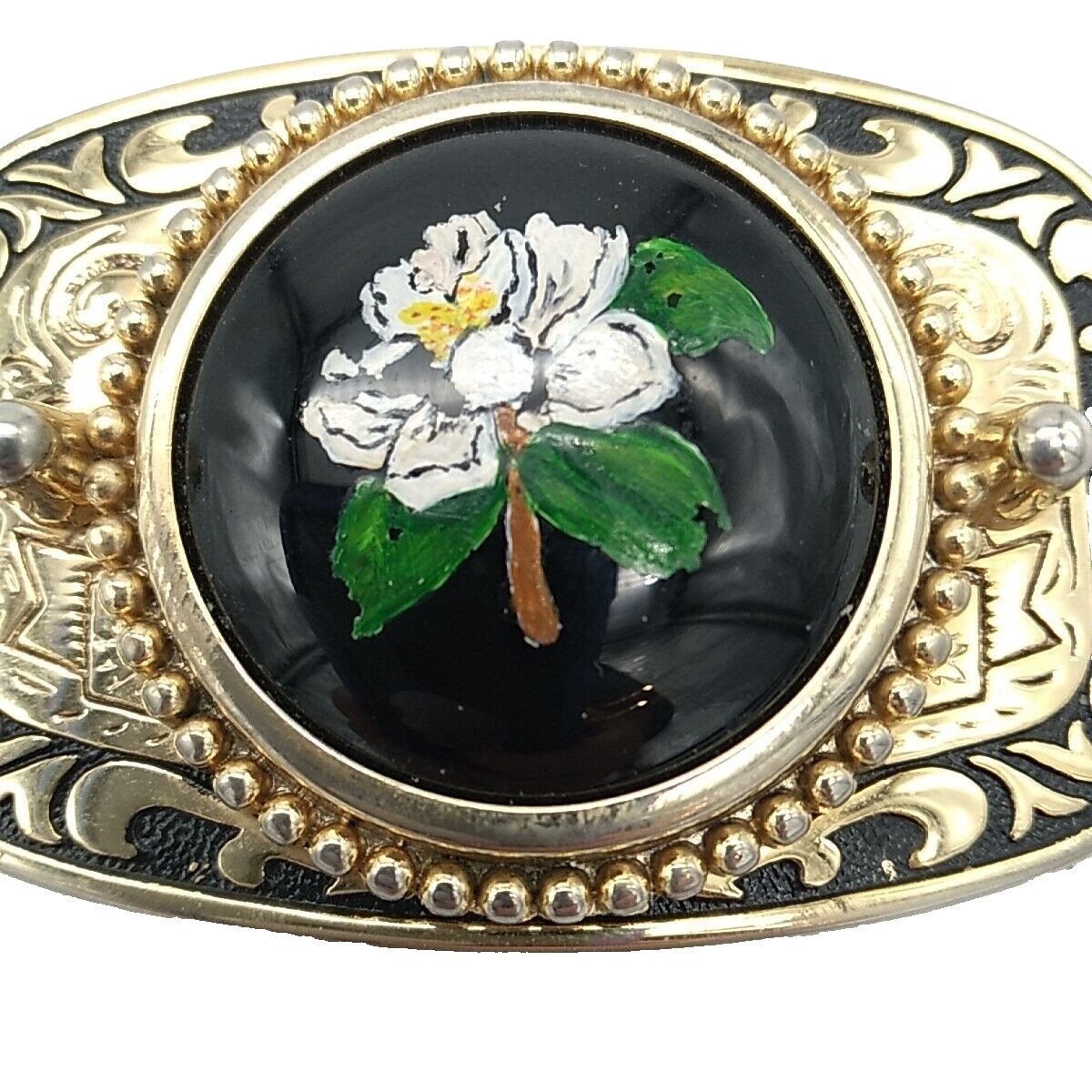 • Gold Tone Western Belt Buckle With White Flower In The Center