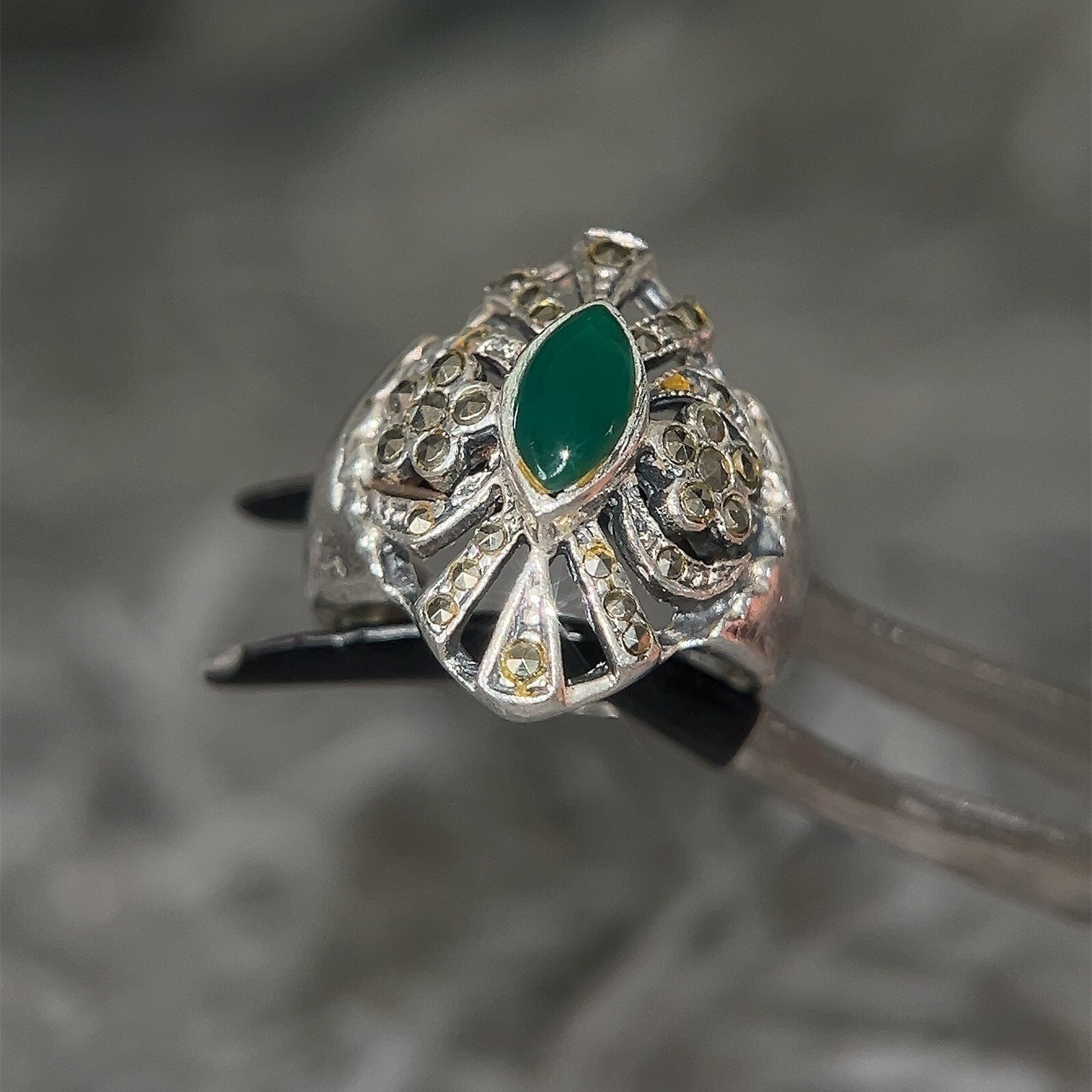 Green Gem/Marcasites Sterling Silver 925 Ring