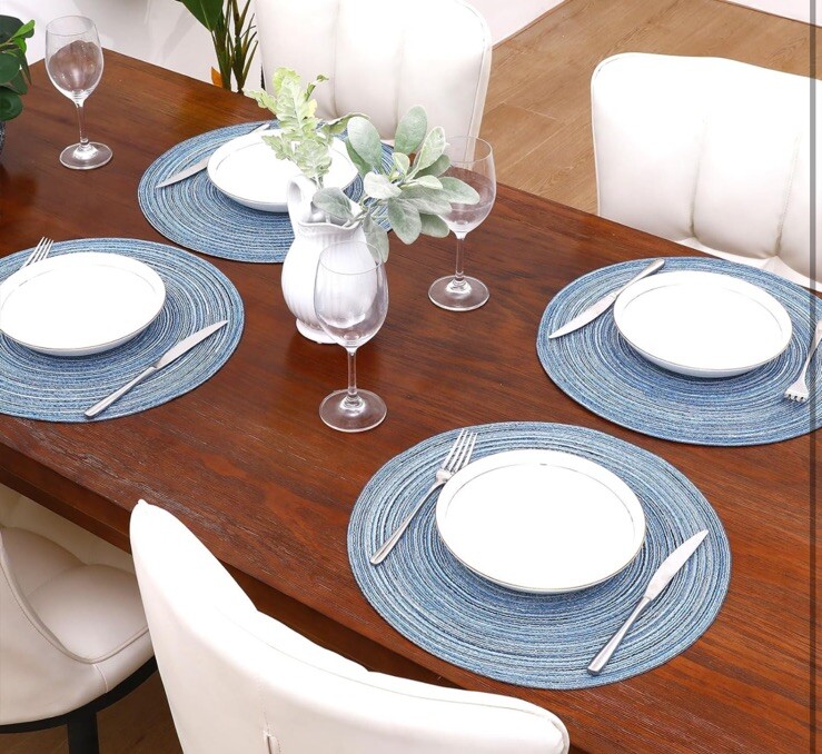 Round Braided Placemats Set of 6 Washable Woven For Kitchen Table-Blue/Grey-New
