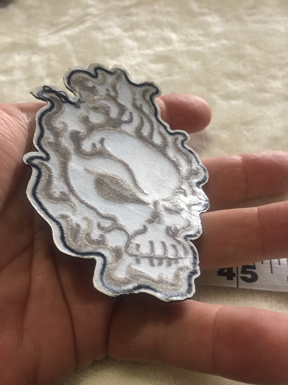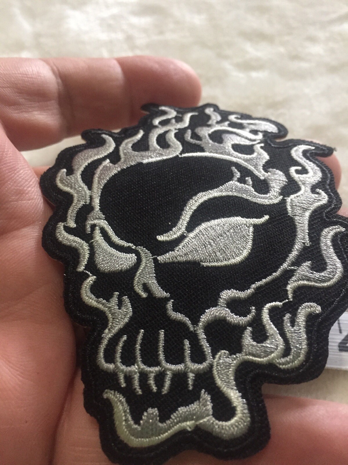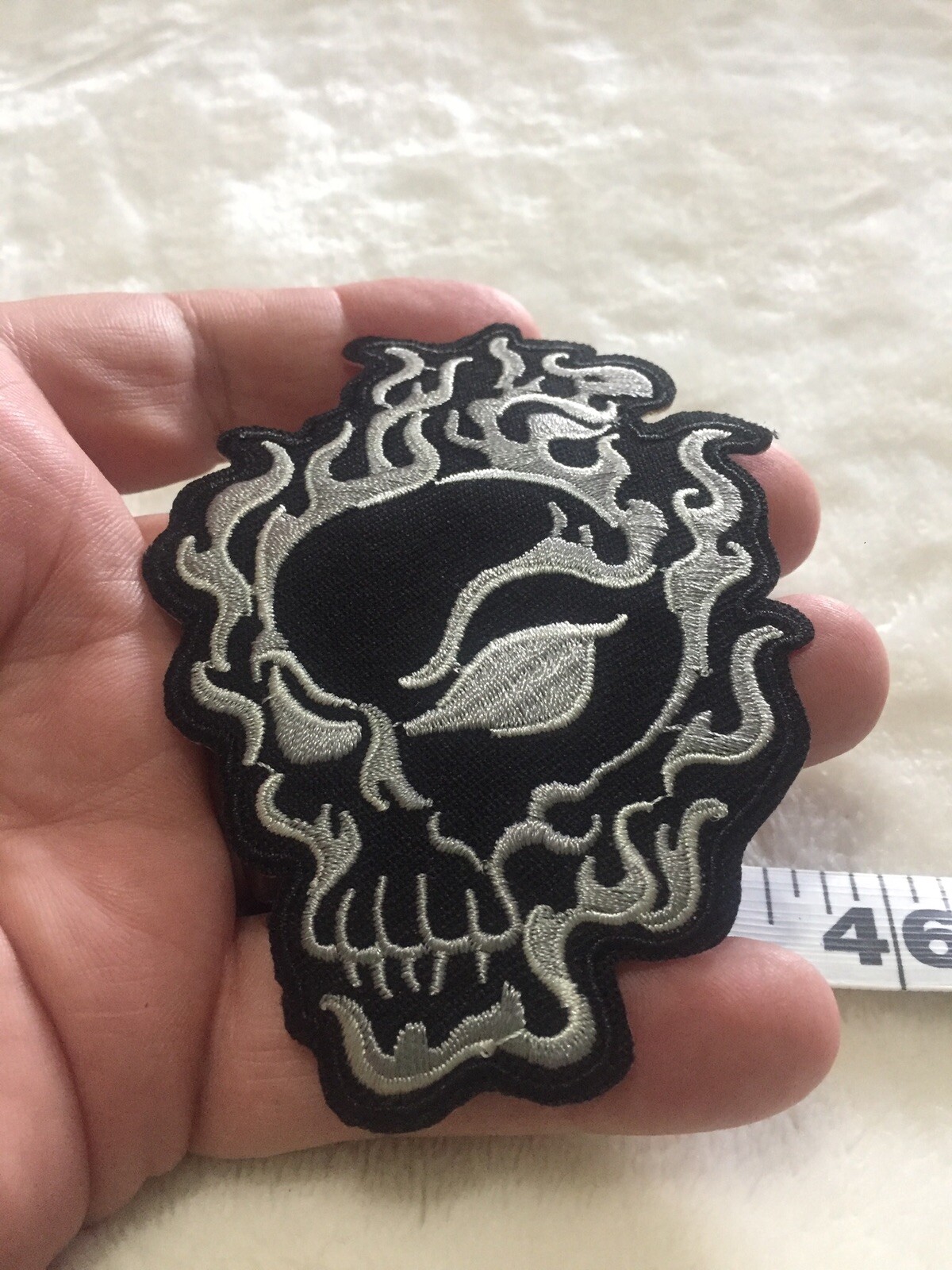 как выглядит Demon Skull On Fire Black Silver Embroidered Iron On Patch New фото
