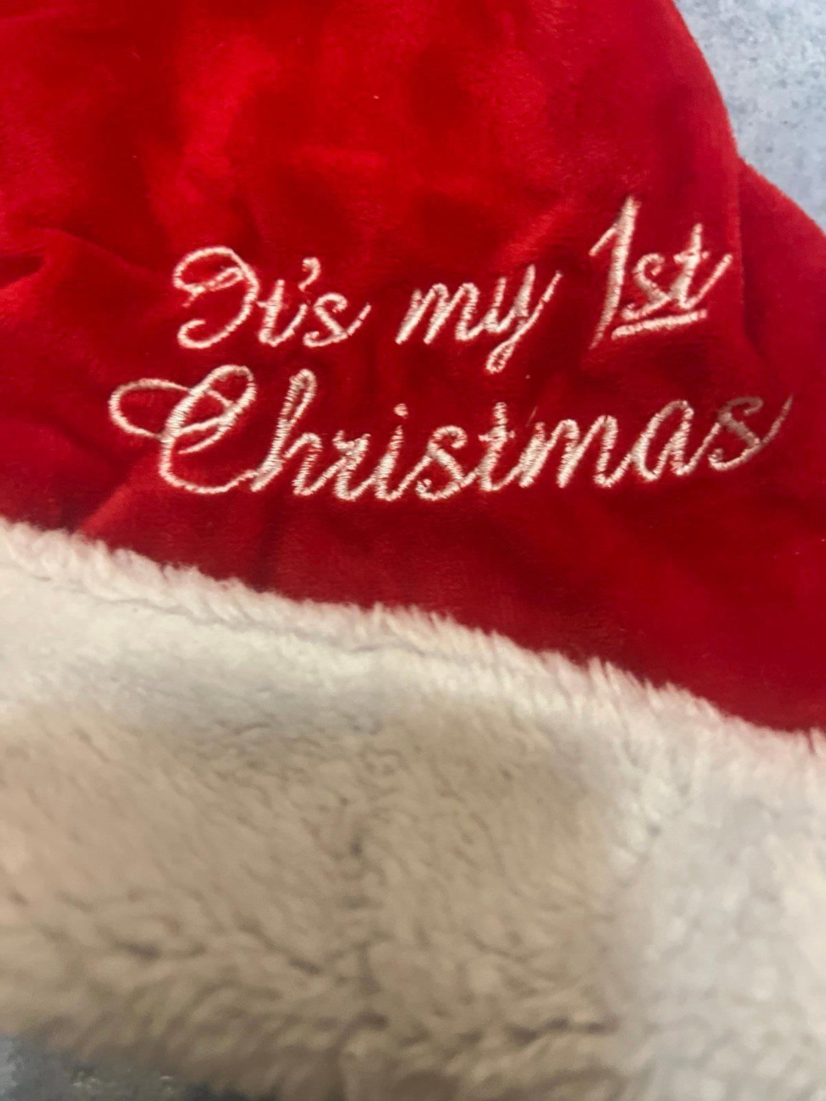 как выглядит Baby first Christmas lot the Place pants and Santa hat фото