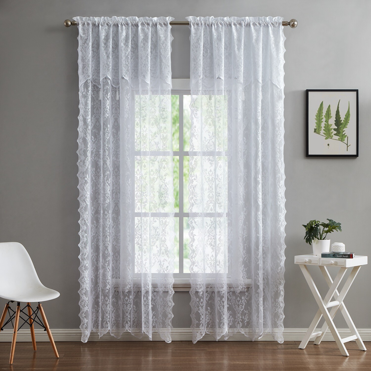 как выглядит WARM HOME DESIGNS Pair of 2 Sheer Lace Curtains with Attached Valances Tassels фото