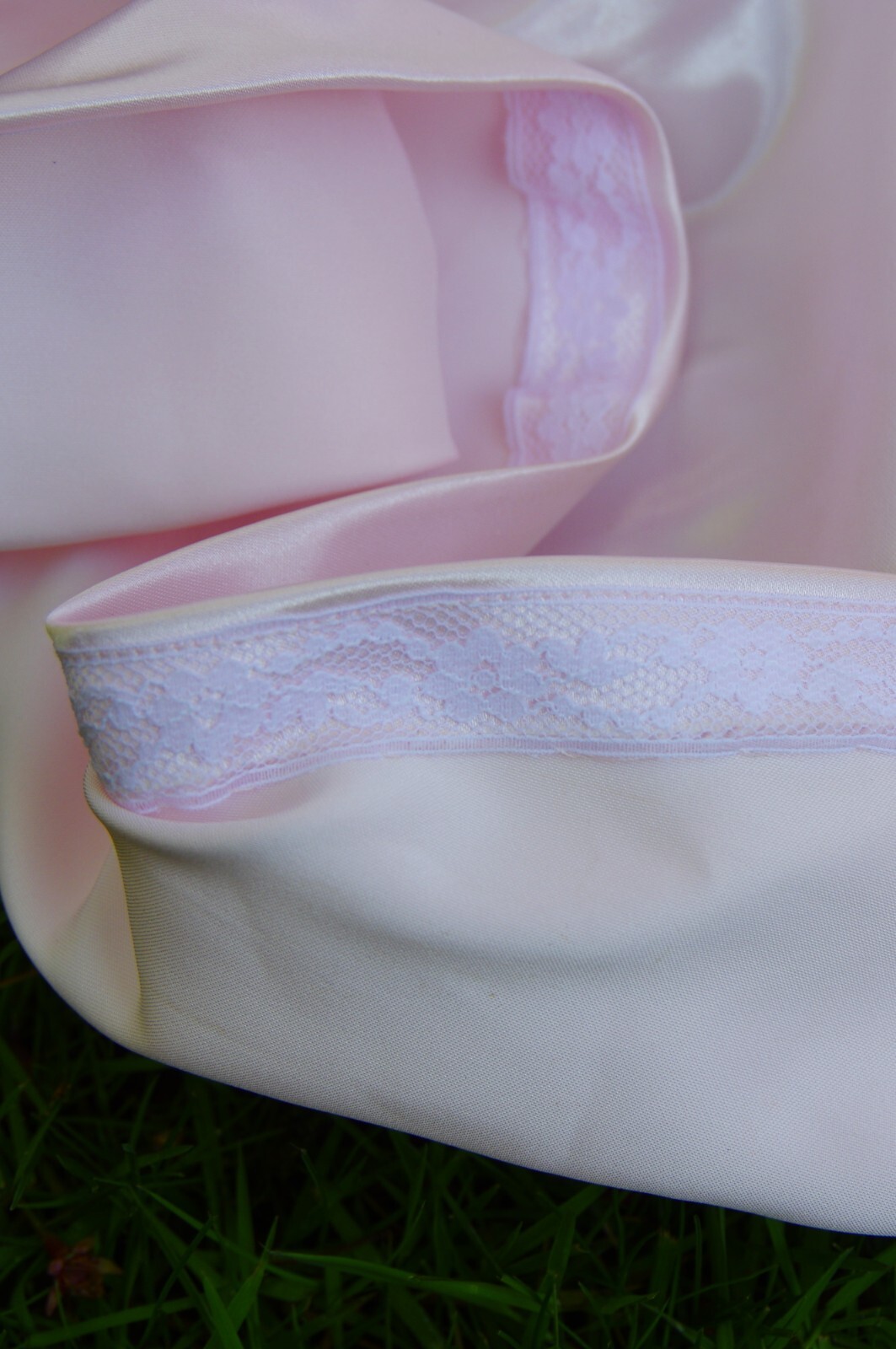 Vintage Pale Pink Wedding Dress with Lace Detailing, Long Train, Large Rear Bow