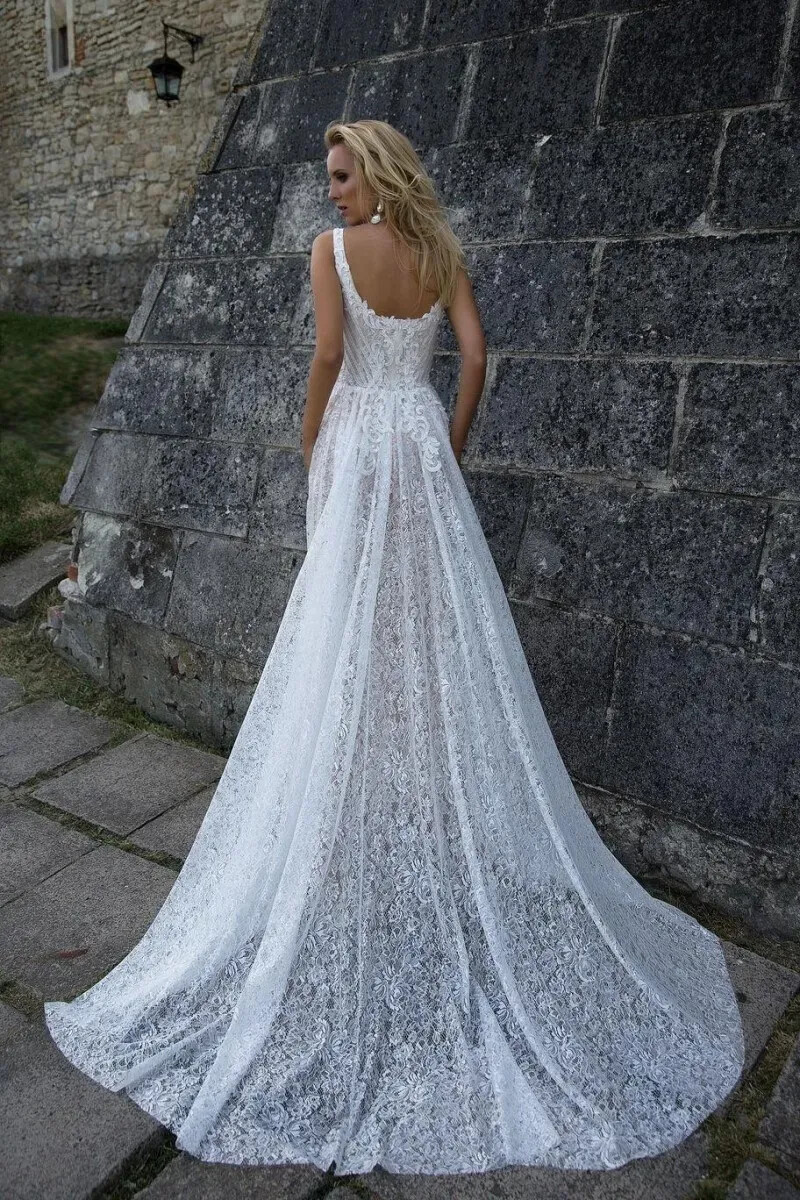 как выглядит Elegant A-Line Wedding Dress Spaghetti Straps Backless Lace Applique Bridal Gown фото
