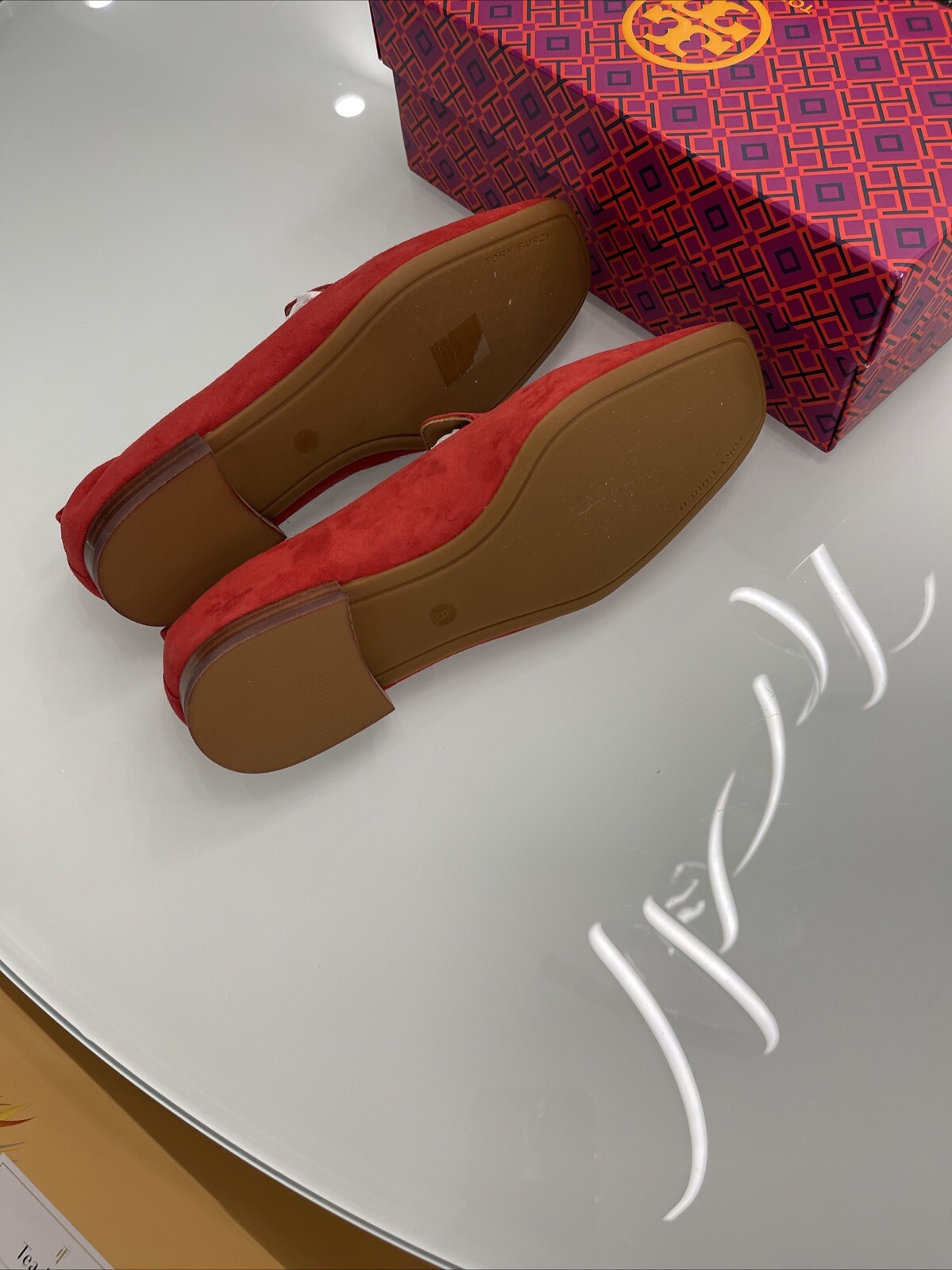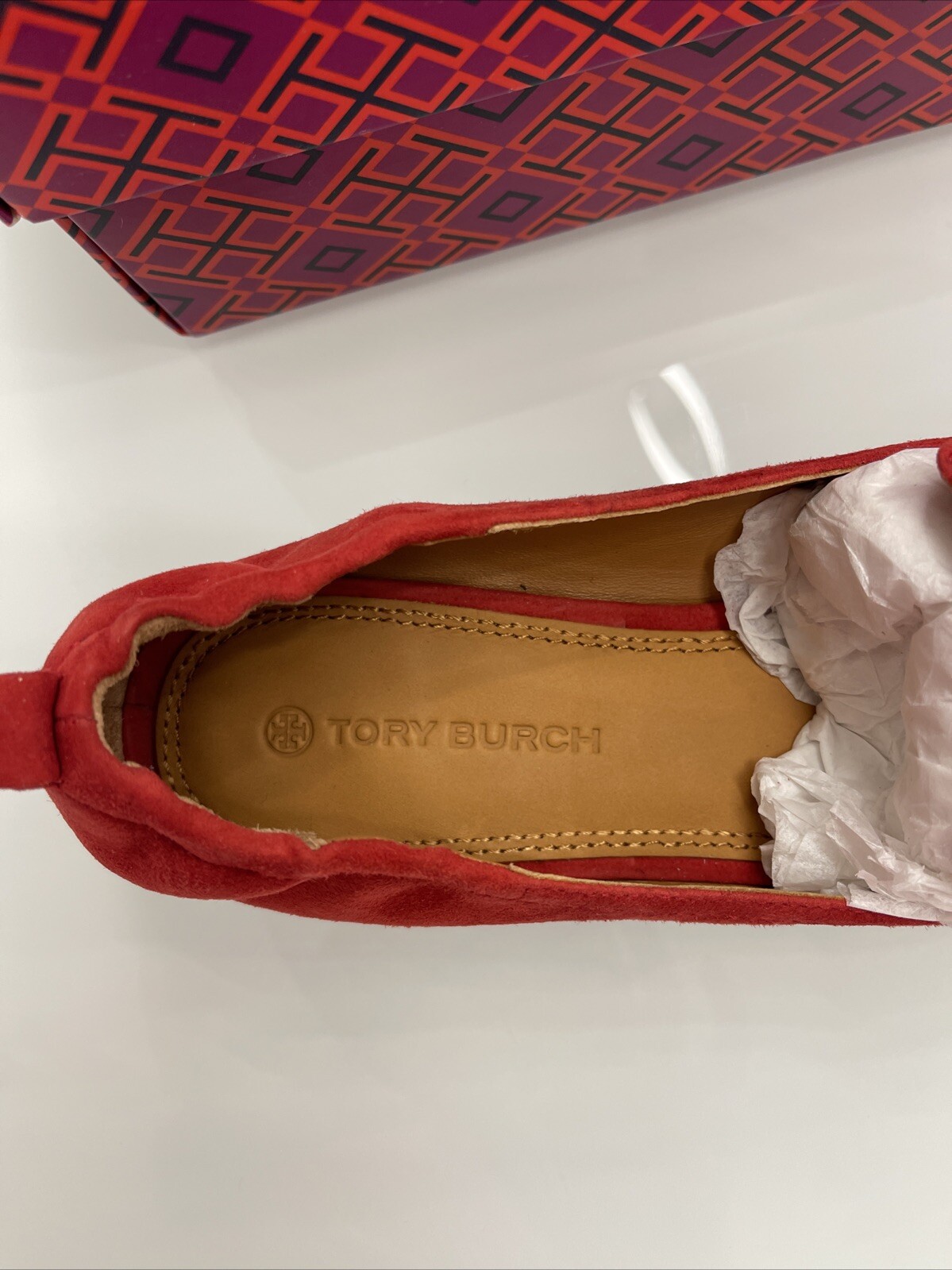 как выглядит 228 Tory Burch Leigh Loafers Flats Carnelian Red Embossed Logo Suede Size 8 фото