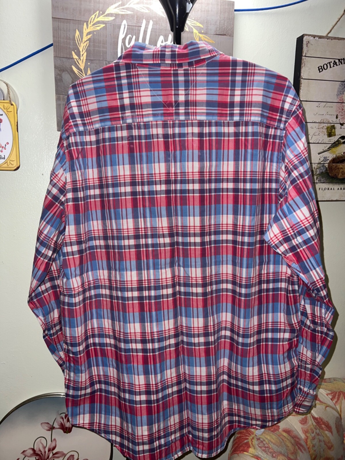 Tommy Hilfiger Long Sleeve Button Down Shirt Red White Blue Plaid Mens Size L