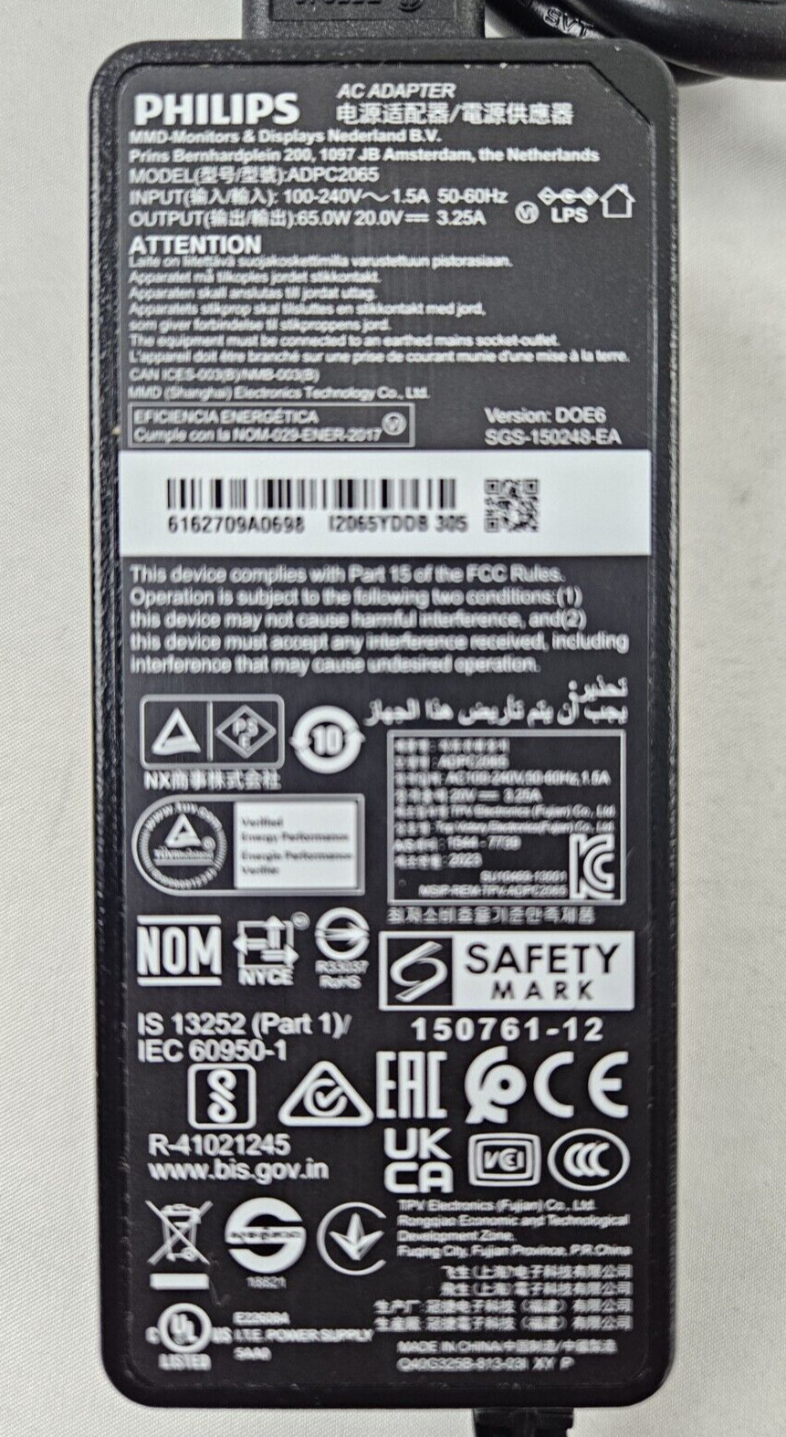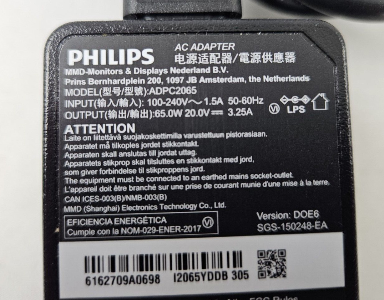 Genuine Philips ADPC2065 20V 3.25A 65W Monitor AC Adapter for 278E1A