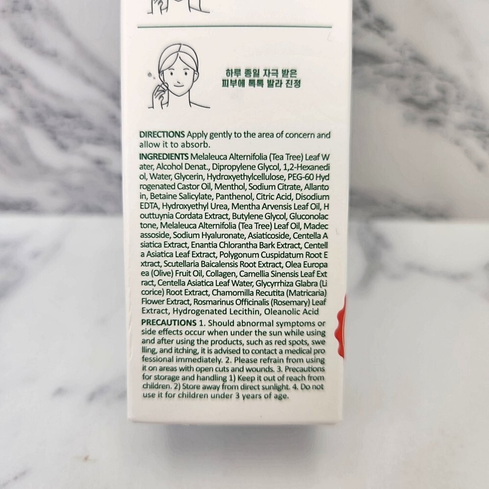 Active Ingredients: Melaleuca Alternifolia (Tea Tree) Leaf Water, Madecassoside, Centella Asiatica Extract