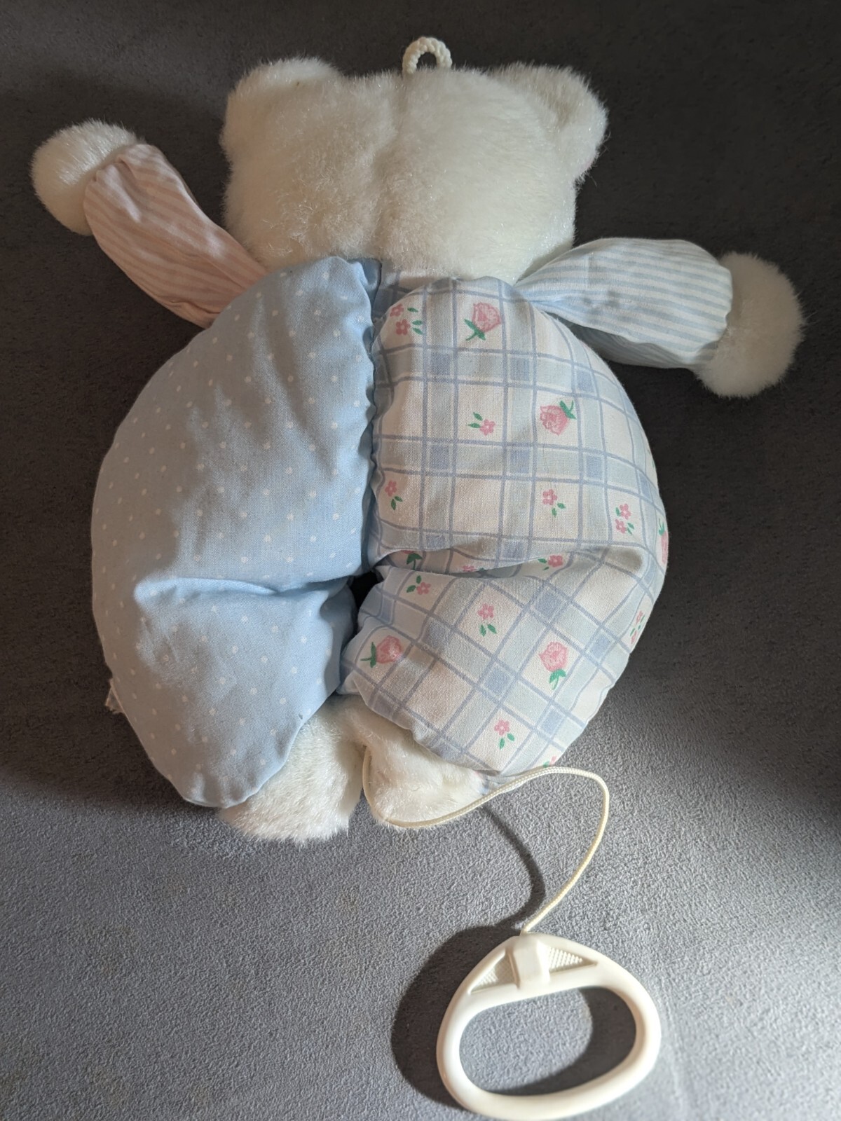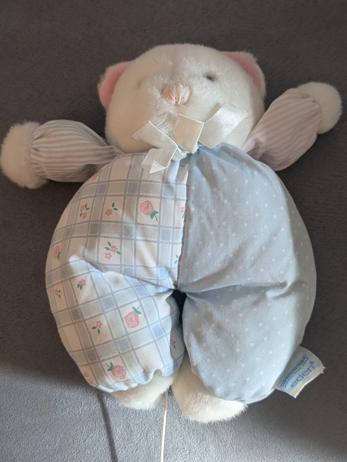 как выглядит Vtg Eden Teddy Bear Musical PULL CRIB TOY Plush Light Blue/Pink/White фото