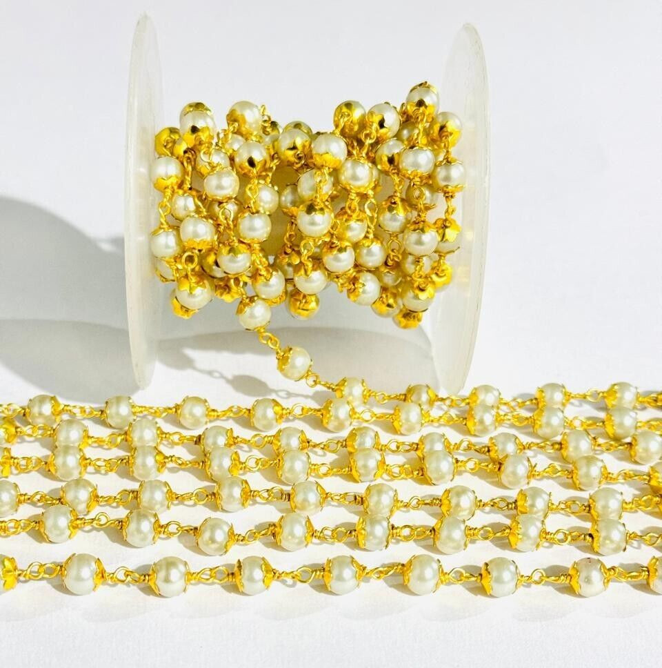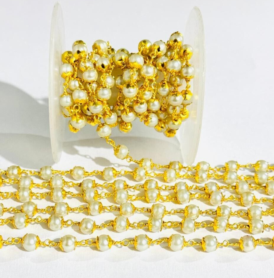 6mm White Pearl Glass Beads Rosary Chain, Gold Plated Brass Wire Wrapped Beaded