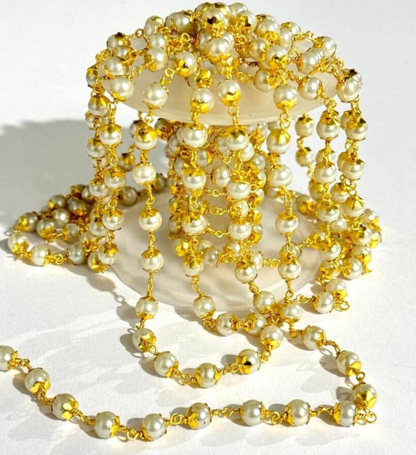 как выглядит 6mm White Pearl Glass Beads Rosary Chain, Gold Plated Brass Wire Wrapped Beaded фото