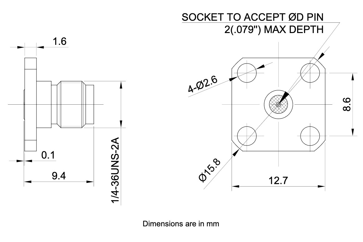 SMA Female Connector, 4 Hole Flange,Acceptable Pin Diameter 0.51mm, DC - 26.5GHz