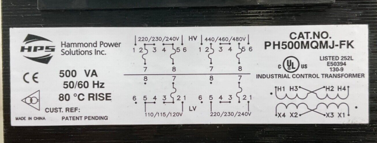 HAMMOND PH500MQMJ-FK TRANSFORMER PRI:240/480VAC SEC:120/240VAC 500VA 4.17/2.08A