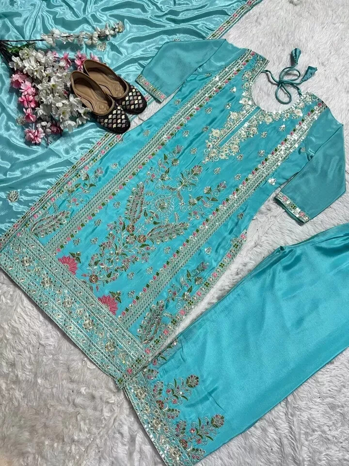 как выглядит Sky Blue Color Heavy Chinnon Silk Palazzo Suit With Designer Dupatta For Women фото