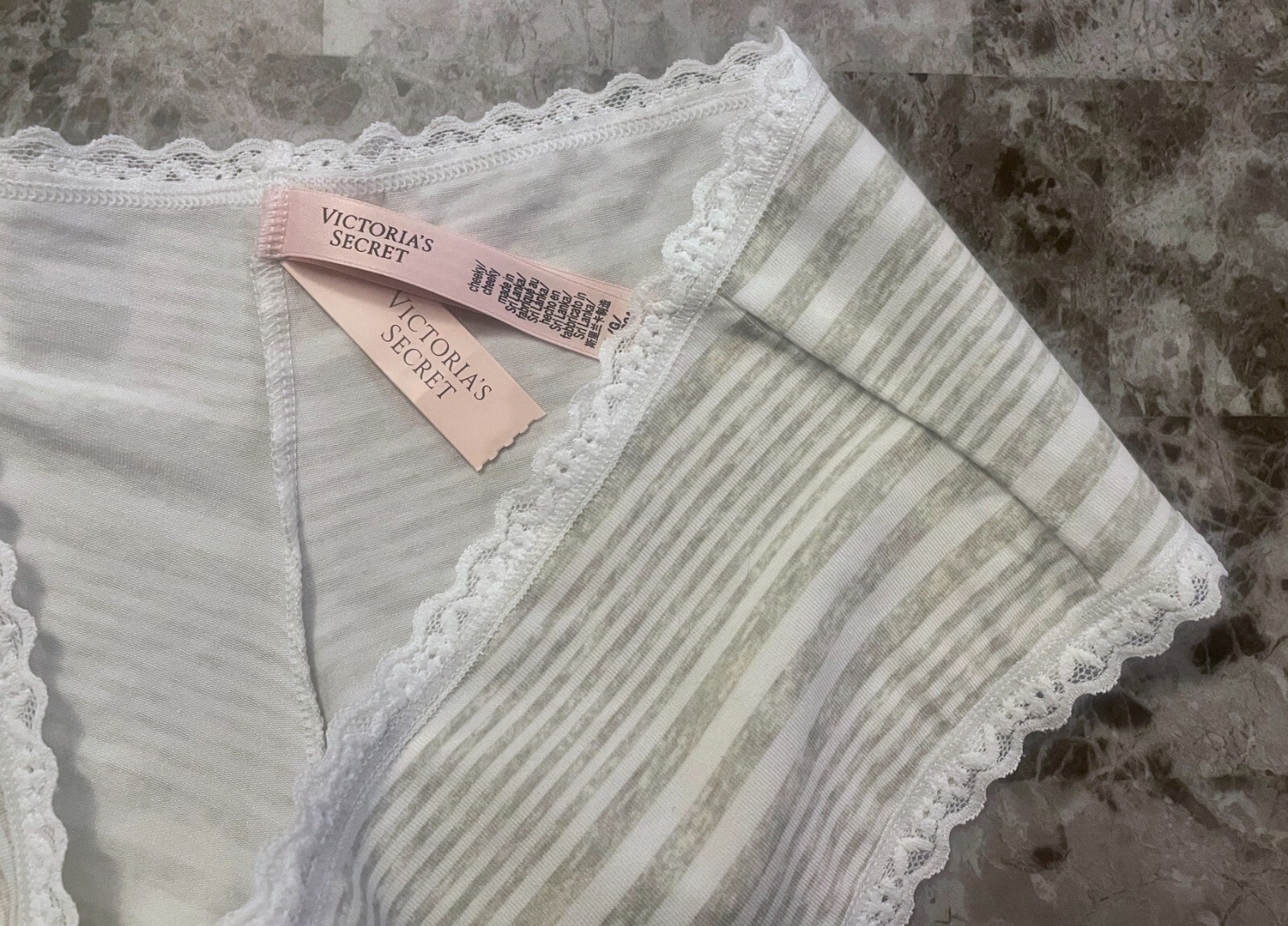 как выглядит NWT VICTORIAS SECRET LARGE WHITE GRAY STRIPE FLORAL LACE CHEEKY PANTIES фото