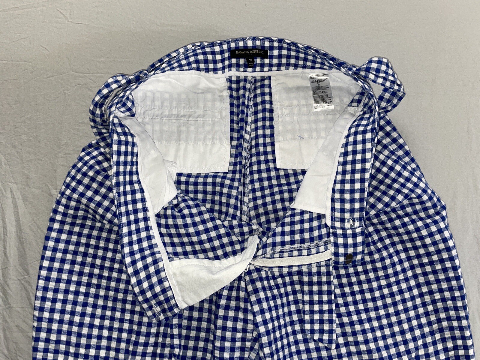 как выглядит Banana Republic Womens Relaxed Taper Belted Linen Blend Pants. Blue Check, 12. фото