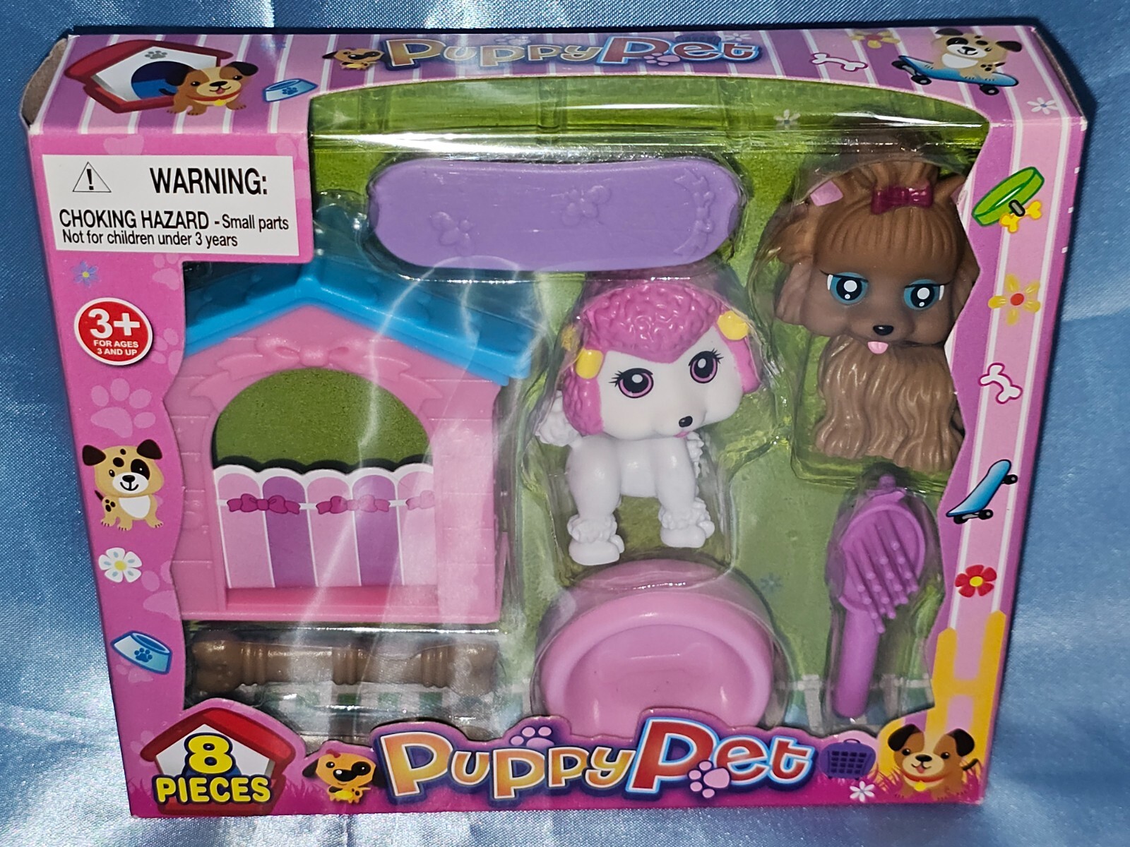 SUPER CUTE PUPPY PET 8 PIECES 2 PUPPIES - HOUSE - BOWL MORE AGES 3 NEW IN BOX