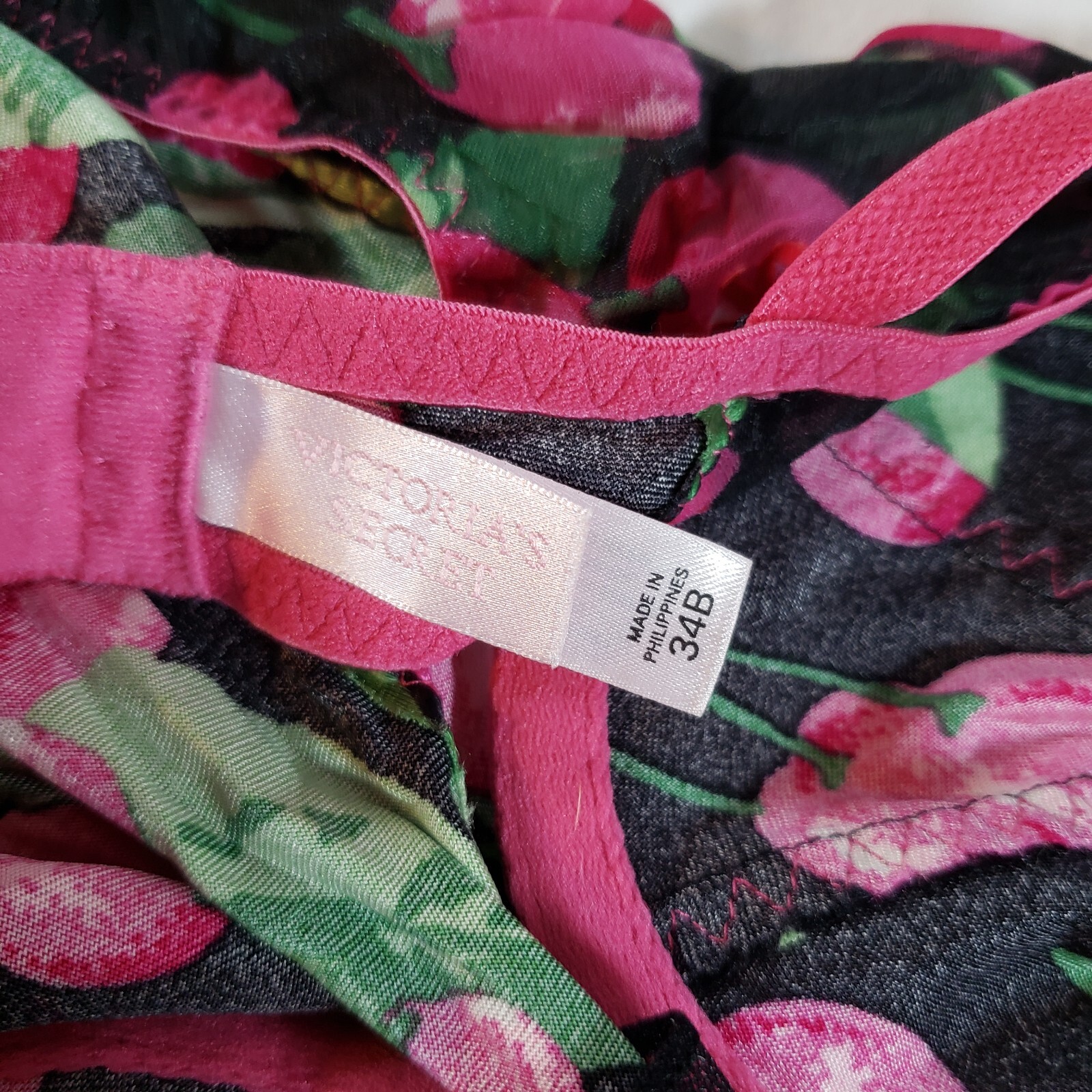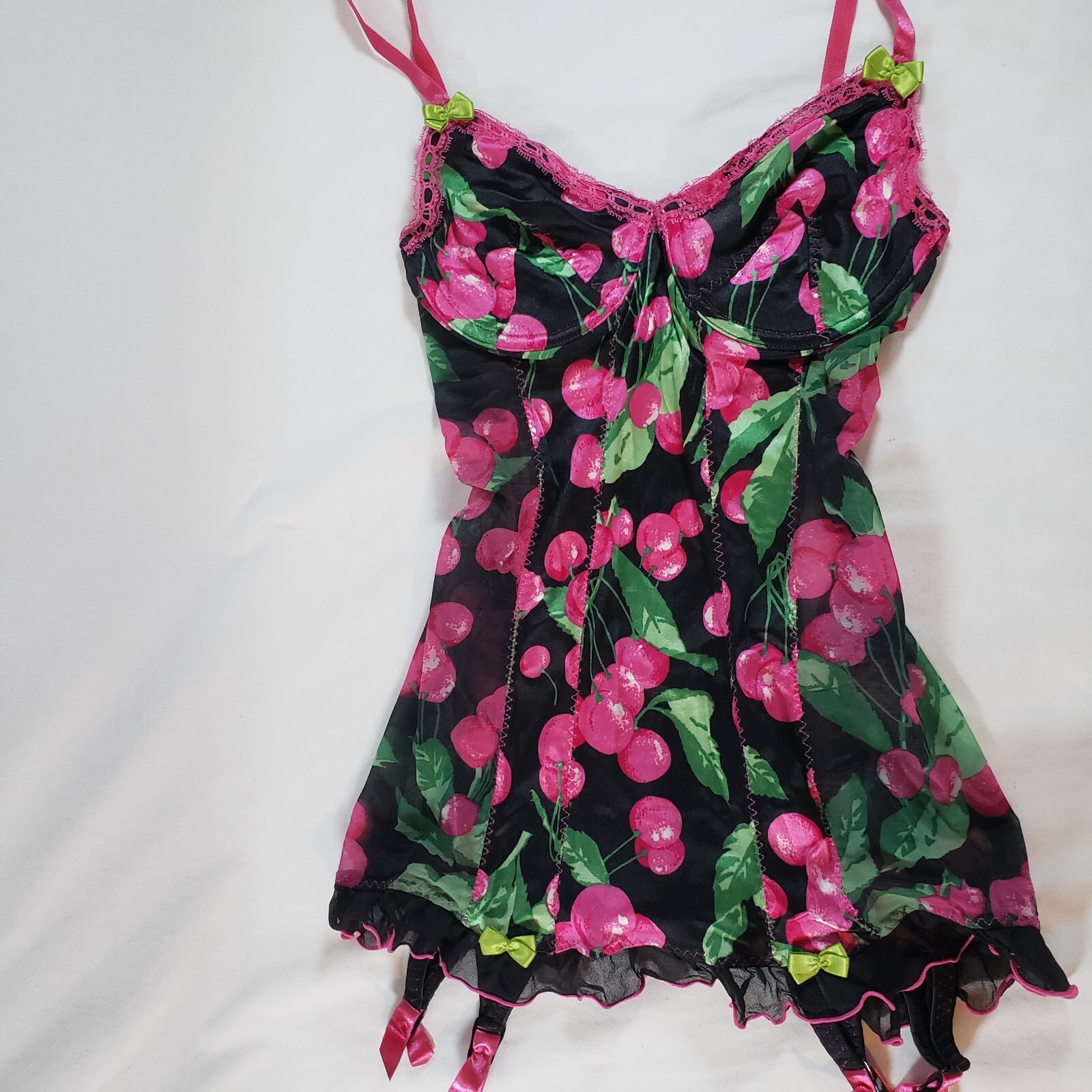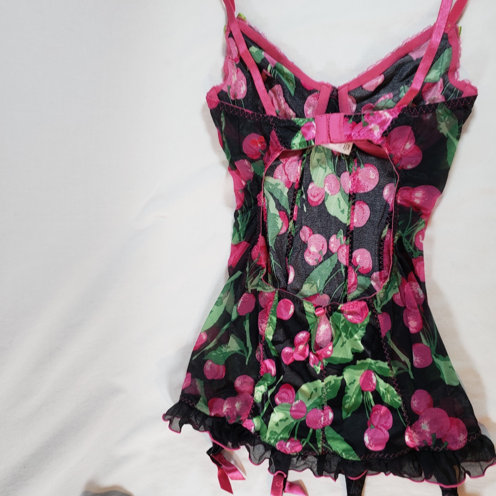 Victoria's Secret 34B Satin Garter Slip Black Pink Cherry Merrywidow