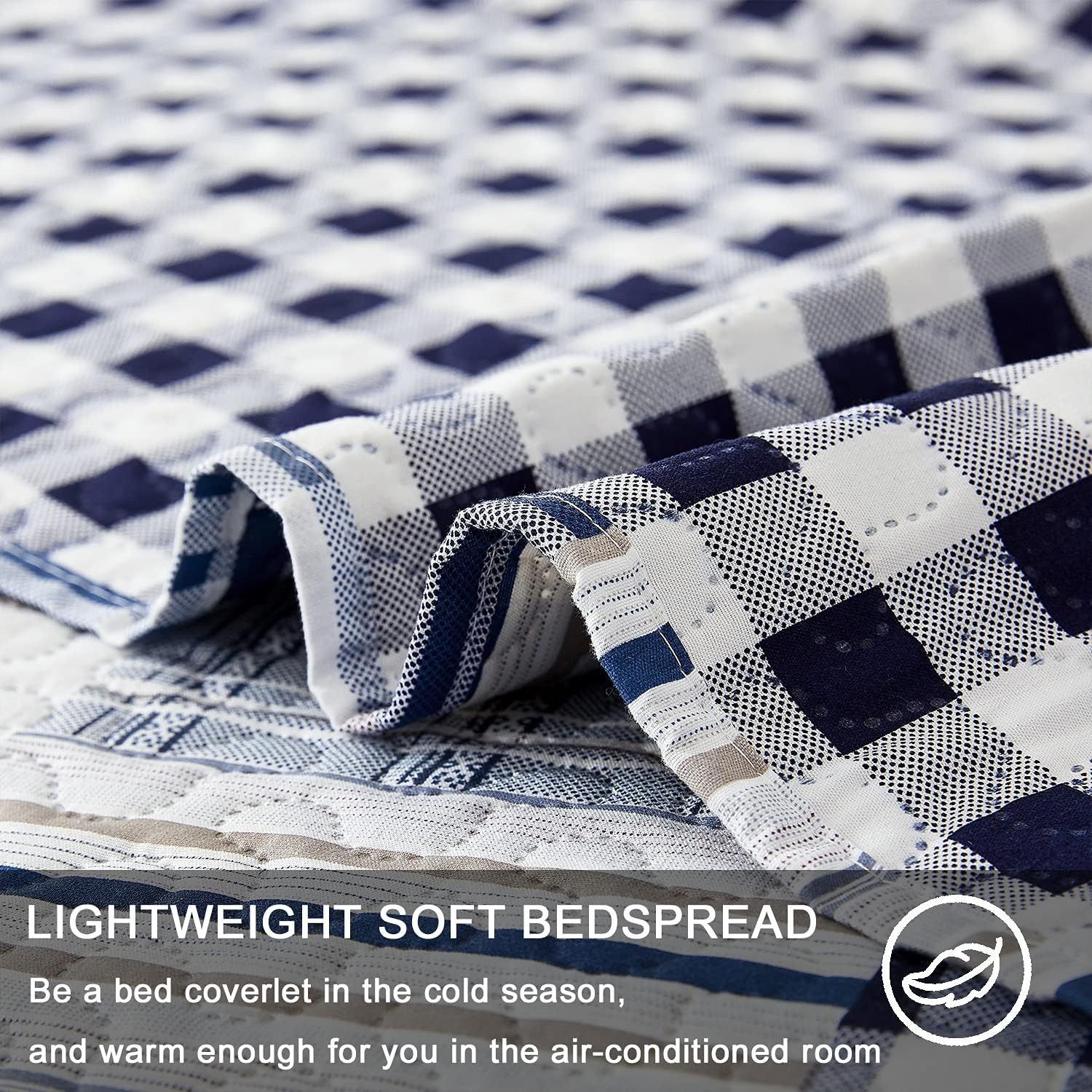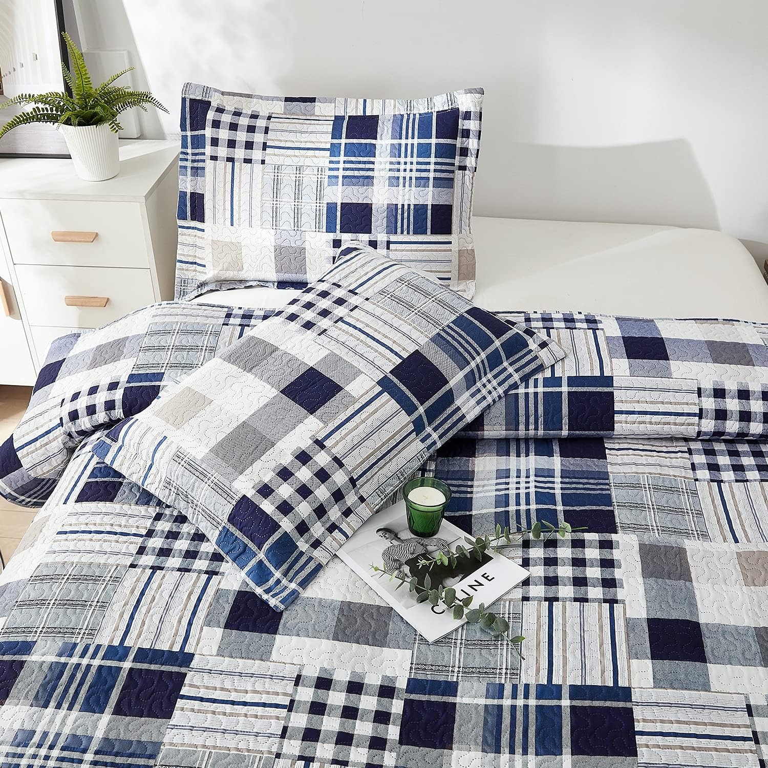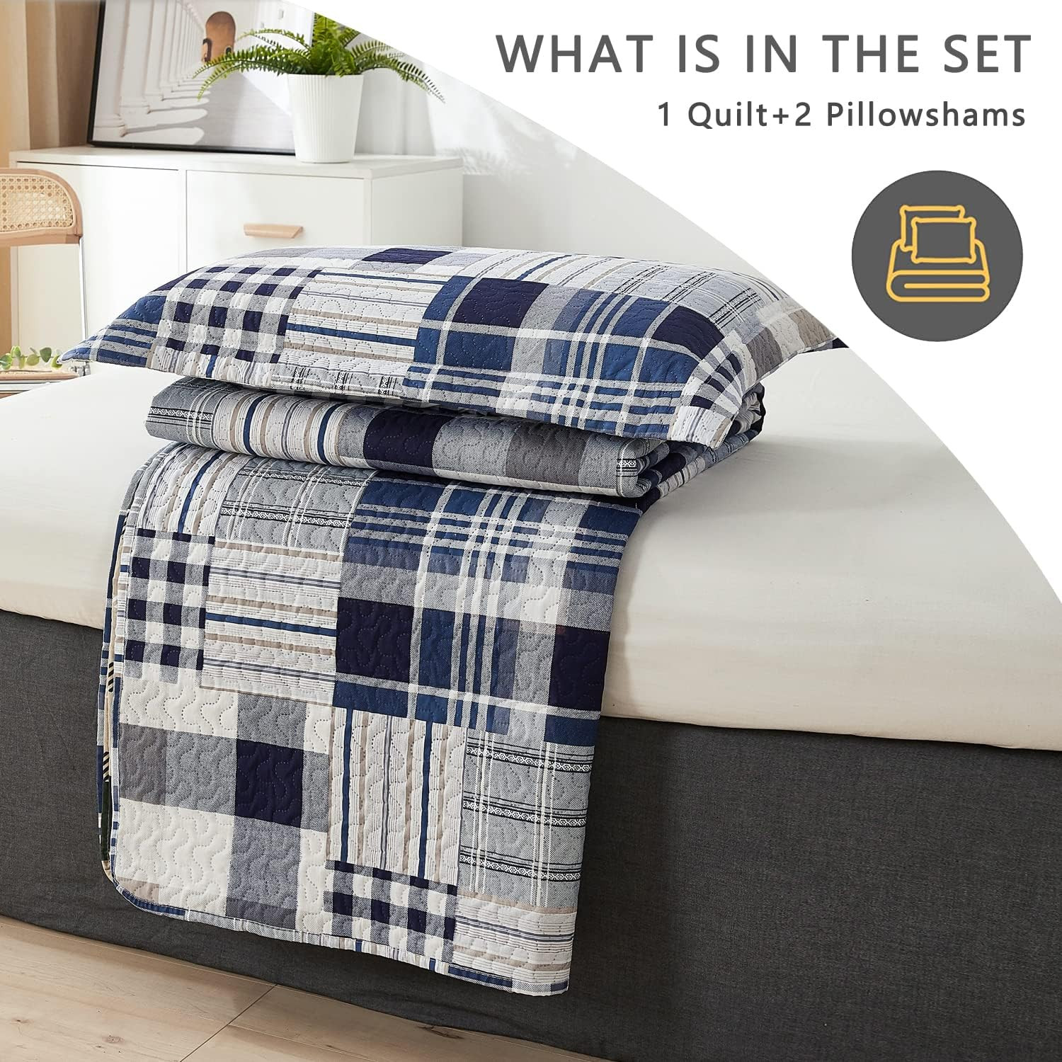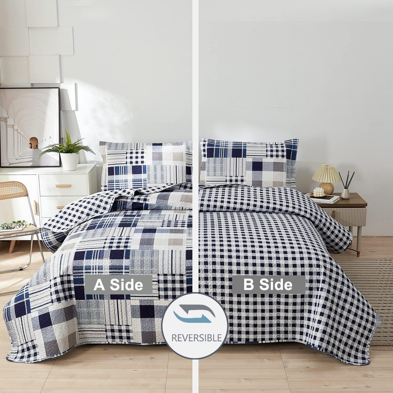 Patchwork Bedding Plaid Quilts Set Full/Queen Size, 3Pcs Navy Blue Buffalo Bedsp