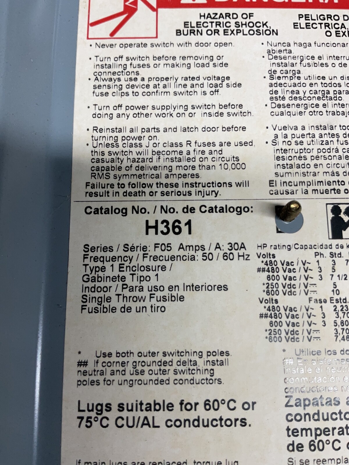 Square D H-361 Heavy Duty Fusible Safety Switch 30A 600V 4010E118PR6
