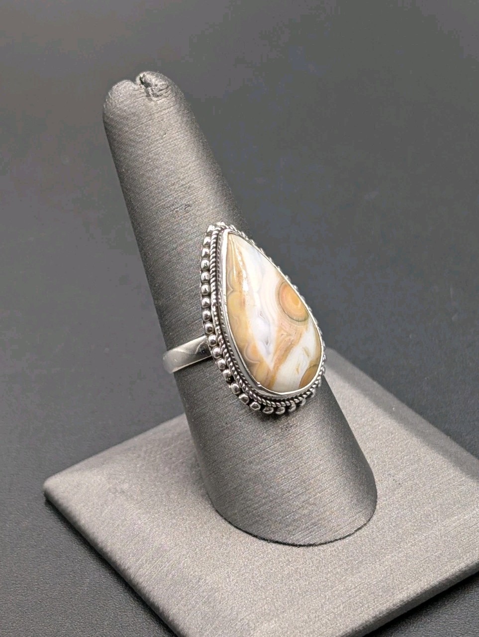 как выглядит Vtg Sterling Silver Teardrop Crazy Lace Agate Stone Bead Rope Edge 925 Ring Sz 8 фото
