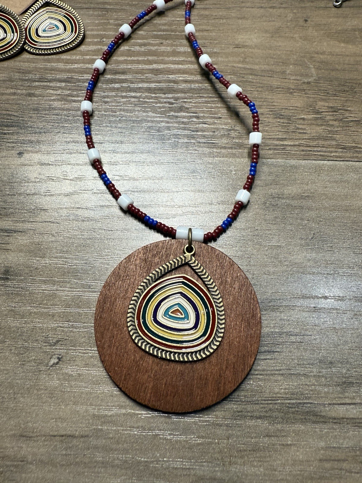 как выглядит 18 Handmade Necklace Earrings Set Geometric Wood White Seed Beads New NWOT фото