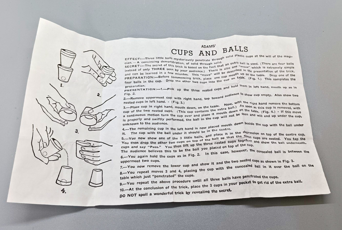 Adams CUPS and BALLS Magic Trick Set INSTRUCTIONS Key Puzzle - Mystery Item