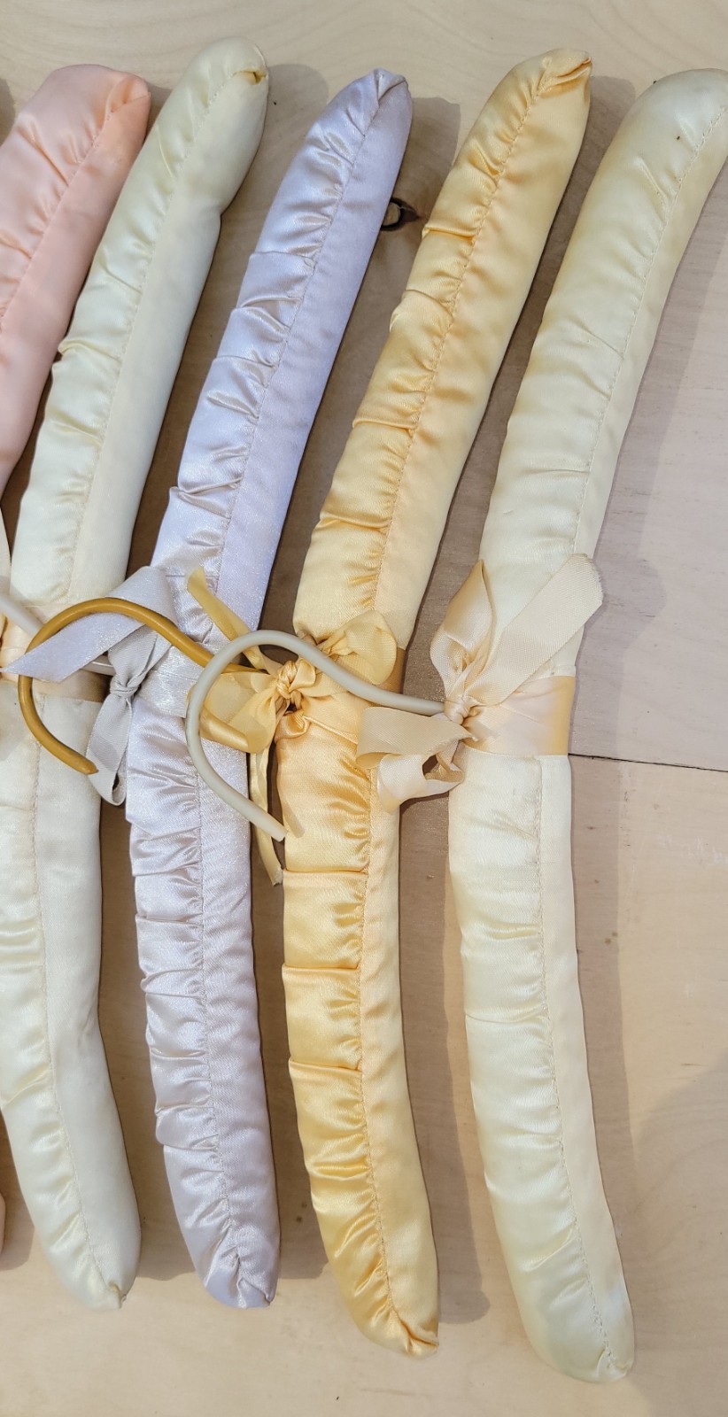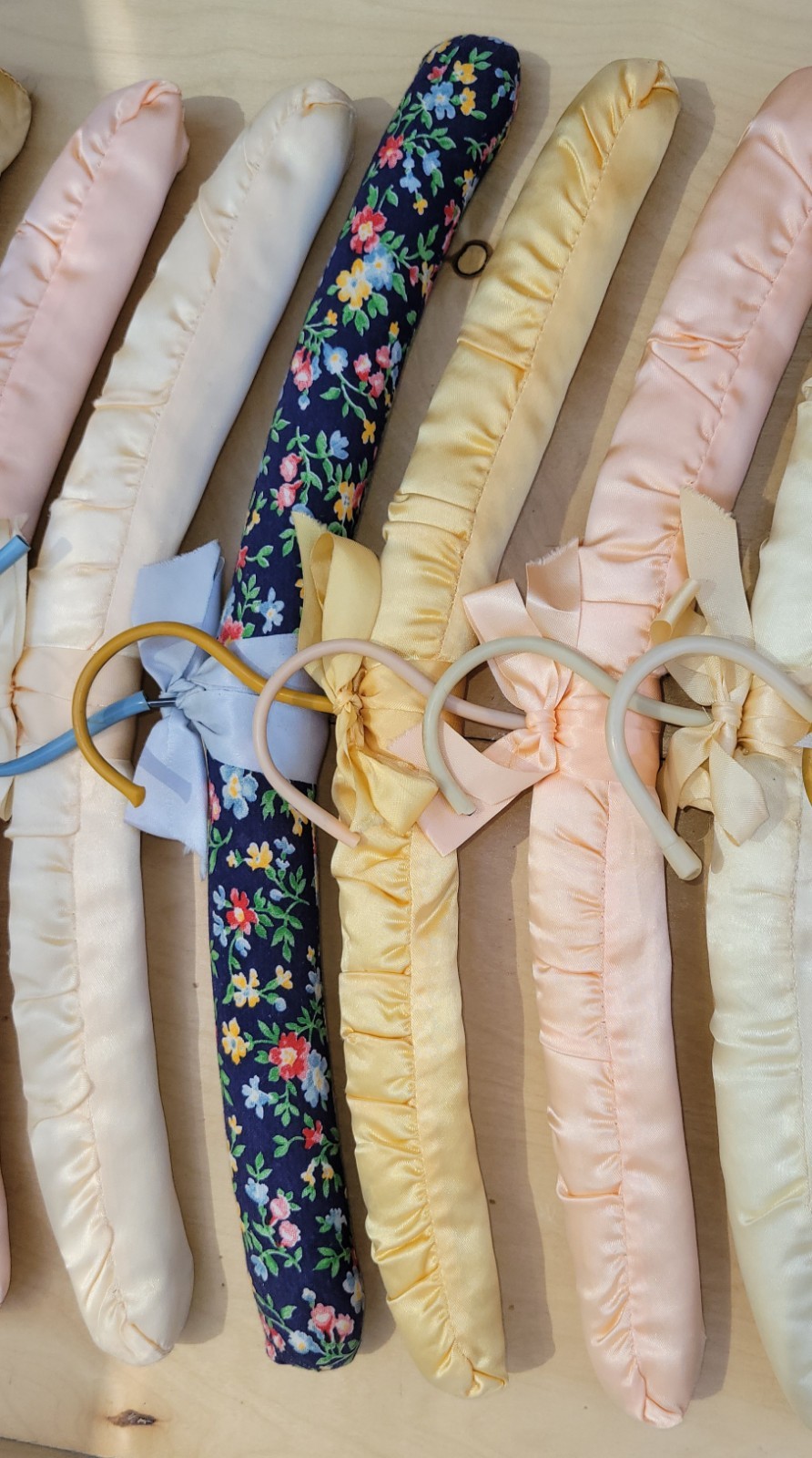 как выглядит Vintage Handmade Silk Covered Wooden Hangers Lot 10 Pastel Colors фото
