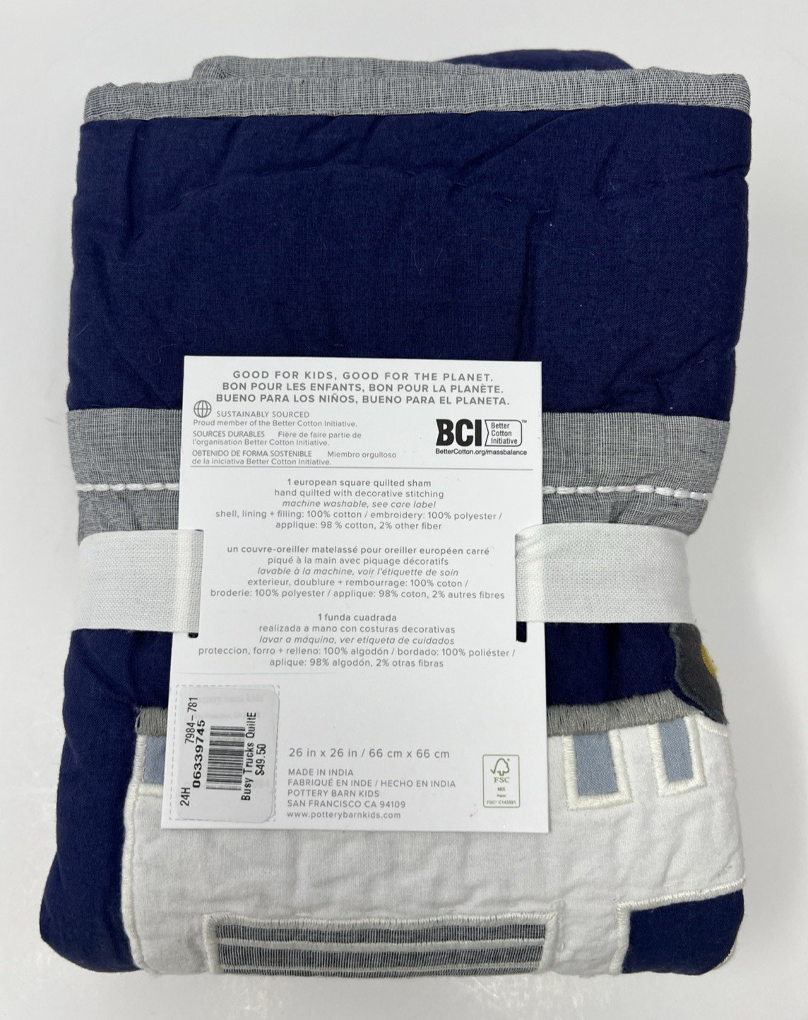 NEW Pottery Barn Kids Busy Trucks Quilted Euro Sham Navy Blue NWT