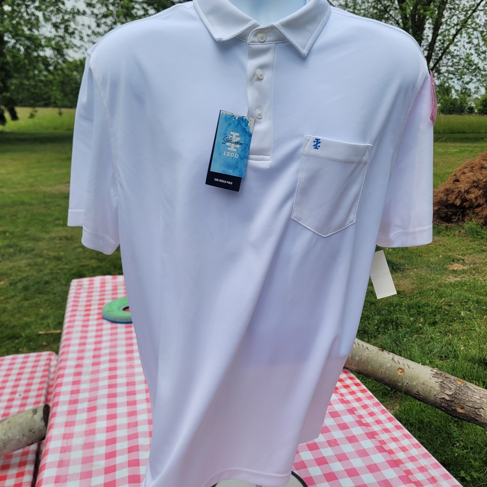 Men's Large IZOD Saltwater Sun Shield Polo w/Blue Crest. Solid White. NWT