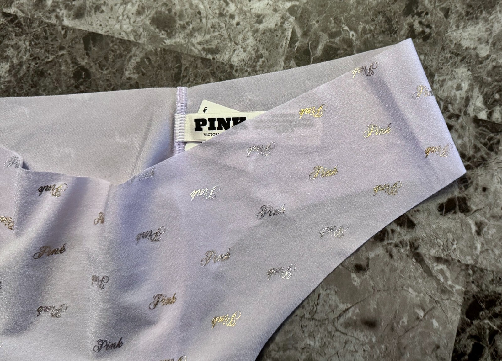 как выглядит NWT VICTORIAS SECRET PINK M LAVENDER GOLD SILVER LOGO NO SHOW THONG PANTIES фото