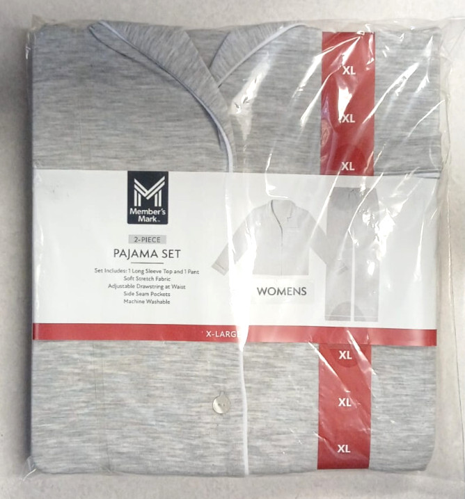 Member's Mark Women 2 Piece Pajama Set XL Gray w/Wht Trim Button-up Top Pant NEW