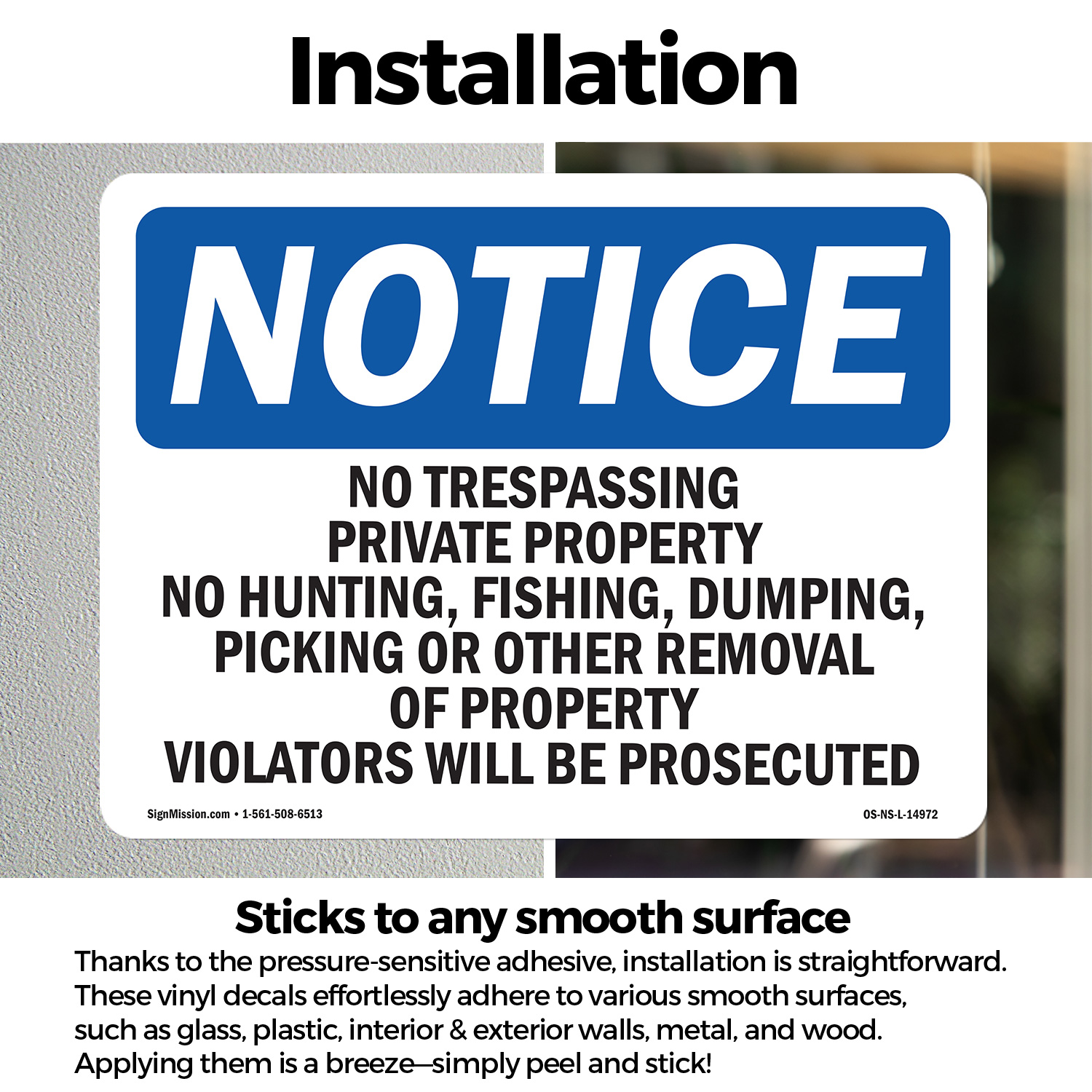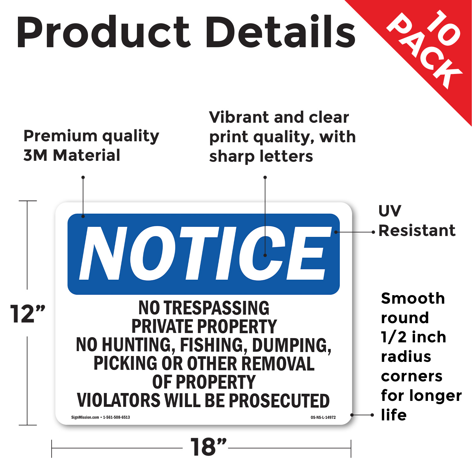 No Trespassing Private Property No Hunting OSHA Notice Sign, Decal 5 or 10 Pack