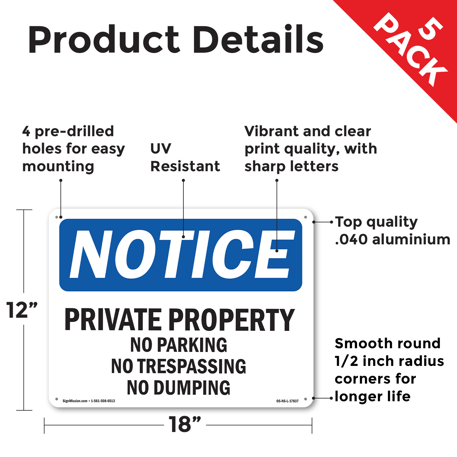 Private Property No Parking No Trespassing OSHA Notice Sign, Decal 5 or 10 Pack