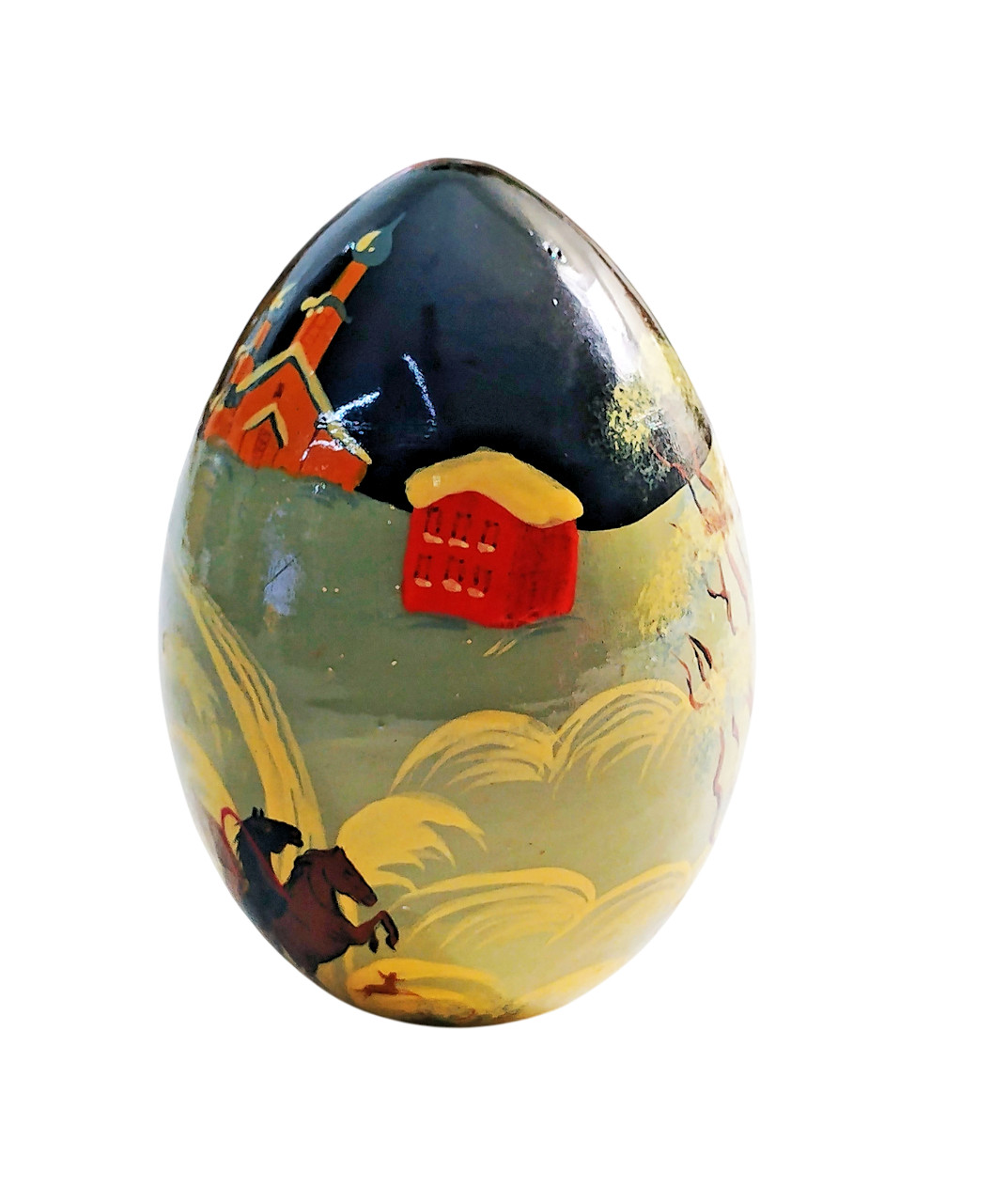 • Vtg Hand-Painted Wooden Egg Russian Folk Art Winter Landscape Decoration 3.9oz