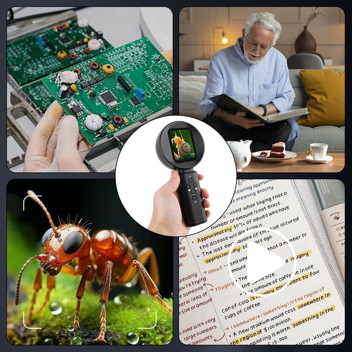 Intended Use/Discipline: Electronics reparing service, magnified reading, Magnifier, Object observation, photography, reading, video recording